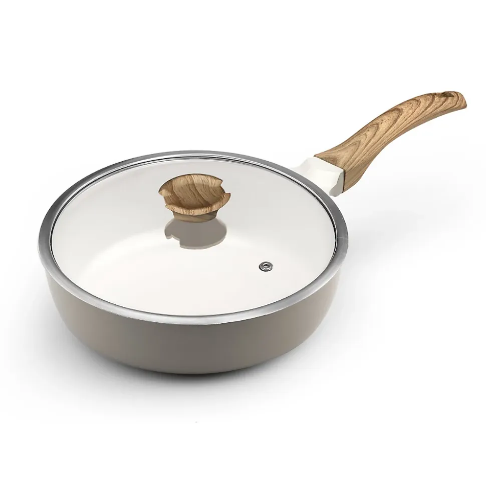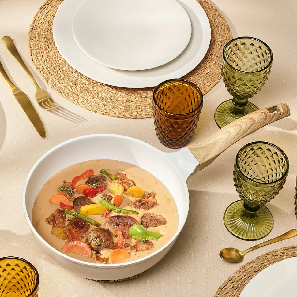 - Sauteuse 24 cm avec revêtement en céramique blanche et couvercle de la collection Mythic par Cuisinox.