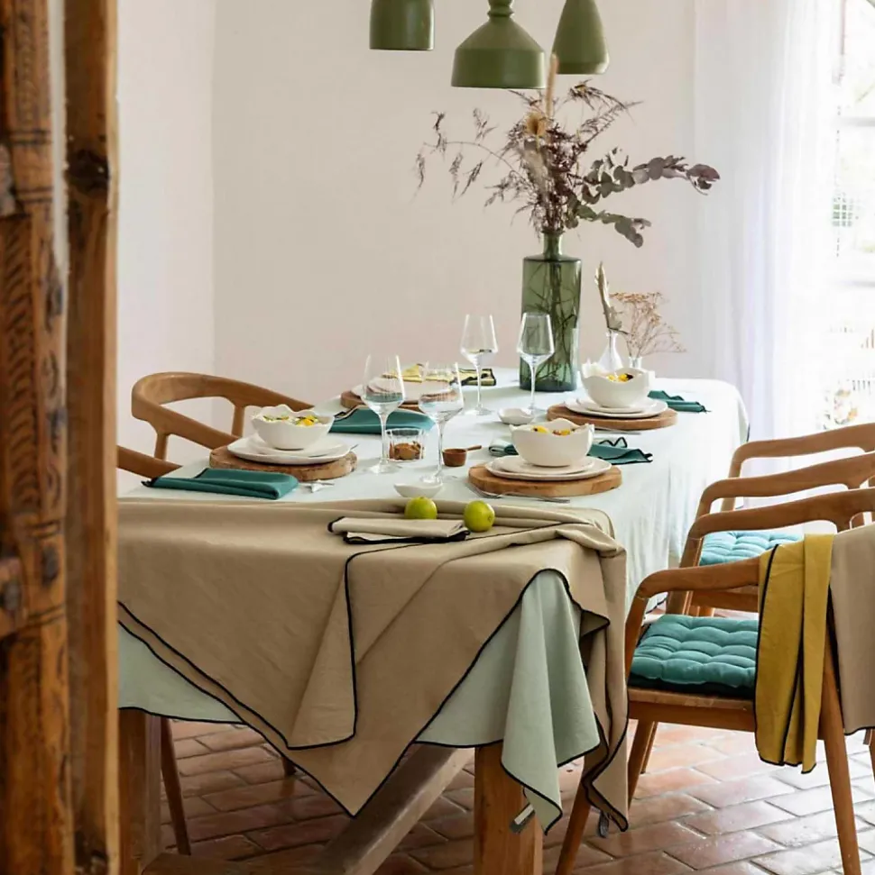 Aspect : Coloris = Céladon • Matériau principal = Coton recyclé • Dimensions : Longueur (en cm) = 140 • Profondeur (en cm) = 250 • Autres caractéristiques : Informations complémentaires = Lavage à 40°, Blanchiment javel et sèche linge interdit , Repassage moyen 150°, Nettoyage à sec interdit • Poids (en kg) = 0,75 • Nappe en coton recyclé Grace 140 x 250 cm