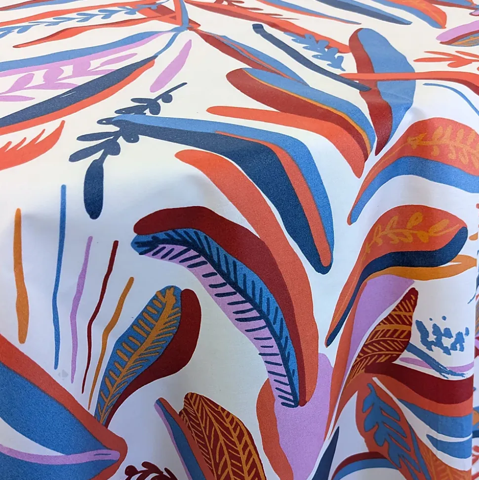 Nappe rectangle 160×300 cm CHILI Salsa – Ambiance gaie et acidulée avec la nappe CHILI imprimée d’un feuillage coloré dans lequel se cachent perruches et cacatoès dans des tons de rose, rouge, orange et bleu sur fond blanc.
