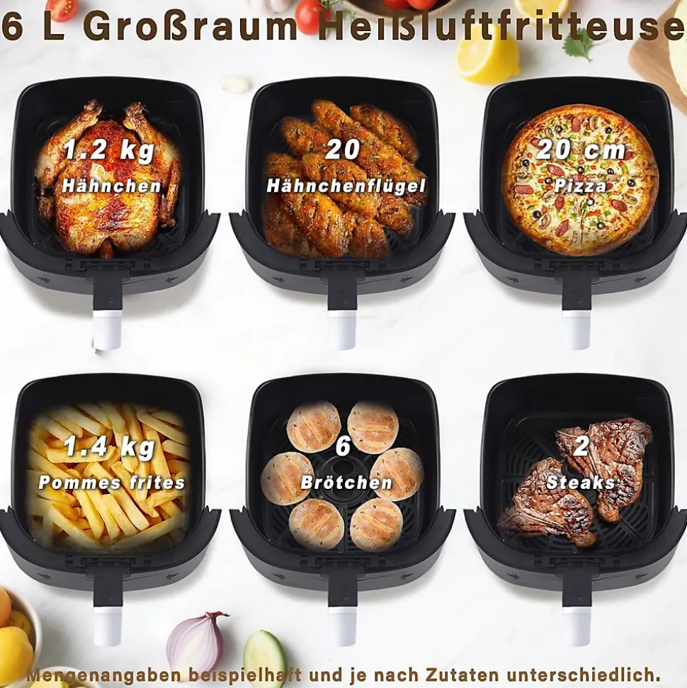 【CUISSON SANS HUILE】Avec la friteuse à air Nettlife, vous pouvez cuisiner sainement sans huile. La combinaison de l’air chaud circulant et d’une température de cuisson optimale garantit des frites croustillantes et des cuisses de poulet tendres et juteuses. Un bip sonore retentit lorsque le temps de cuisson est écoulé ; une expérience gustative unique vous attend.【CUISSON POLYVALENTE】La friteuse à air est dotée d’un écran LED clair avec 7 programmes préréglés, sélectionnables via l’écran tactile. D’une simple pression sur un bouton, vous pouvez préparer vos plats préférés tout en vous concentrant sur d’autres tâches. La température (80-200 °C) et le temps de cuisson (jusqu’à 60 minutes) sont réglables manuellement : une utilisation plus simple que jamais.【FENÊTRE DE VISUALISATION ET CAPACITÉ XXL】La friteuse à air Nettlife est équipée d’un panier de friture de grande capacité de 6 L et d’une fenêtre de visualisation éclairée qui vous permet de visualiser clairement l’état de cuisson sans avoir à ouvrir le panier. La friteuse à air Nettlife XXL 6 L est spécialement conçue pour les cuisines familiales de 5 à 6 personnes. Avec une puissance de 1500 W, elle est très puissante, réduit le temps de cuisson et économise ainsi l’électricité.【FACILE À NETTOYER ET SÛR À UTILISER】Cette friteuse à air est particulièrement facile d’entretien : le panier de friture est facile à nettoyer et amovible grâce à son revêtement antiadhésif. La poignée froide au toucher prévient les brûlures et les chutes accidentelles. La protection contre la surchauffe et l’arrêt automatique garantissent une utilisation sûre de la friteuse à air. Pour toute question concernant les recettes allemandes, veuillez contacter notre service client ! Nous fournissons les recettes au format PDF.【ACHAT SÉCURISÉ】Nous offrons une garantie de 2 ans sur la friteuse à air Nettlife.