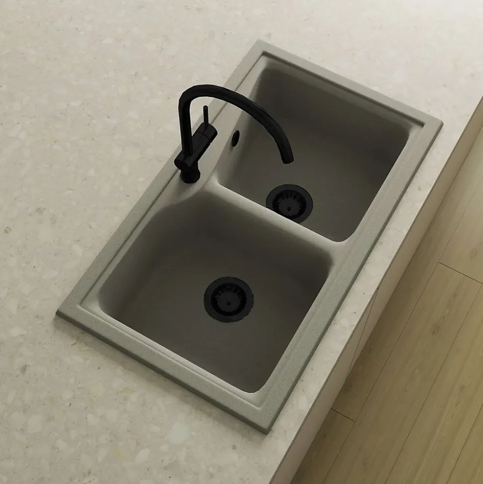 Pack évier à installation sur plan (à encastrer) avec deux cuves + un mitigeur avec douchette extractible + une bonde avec trop pleinRésistance aux rayures, à l’abrasion, à la chaleur (185°C), aux agents chimiques et aux colorants selon les tests UNE-EN 13310 -> Sans altérationLivré avec bonde manuelle carré, siphon et colle mastic.