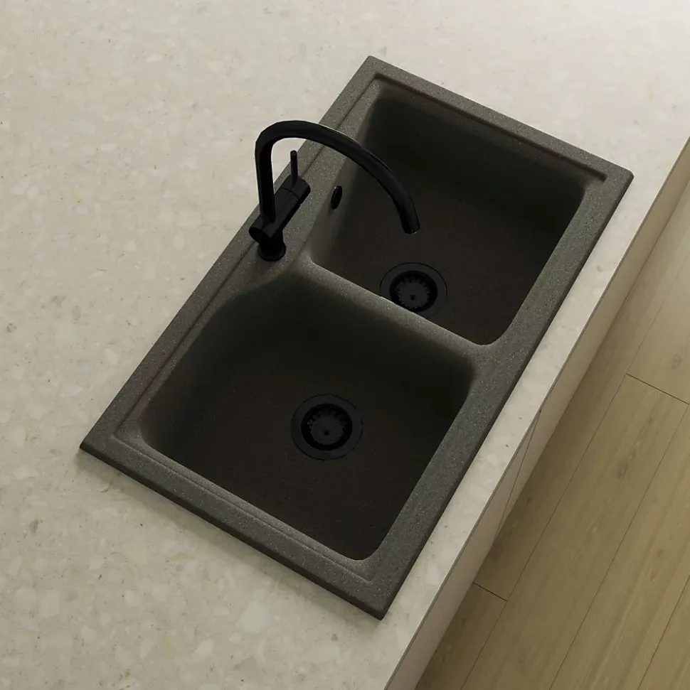 Pack évier à installation sur plan (à encastrer) avec deux cuves + un mitigeur avec douchette extractible + une bonde avec trop pleinRésistance aux rayures, à l’abrasion, à la chaleur (185°C), aux agents chimiques et aux colorants selon les tests UNE-EN 13310 -> Sans altérationLivré avec bonde manuelle carré, siphon et colle mastic.