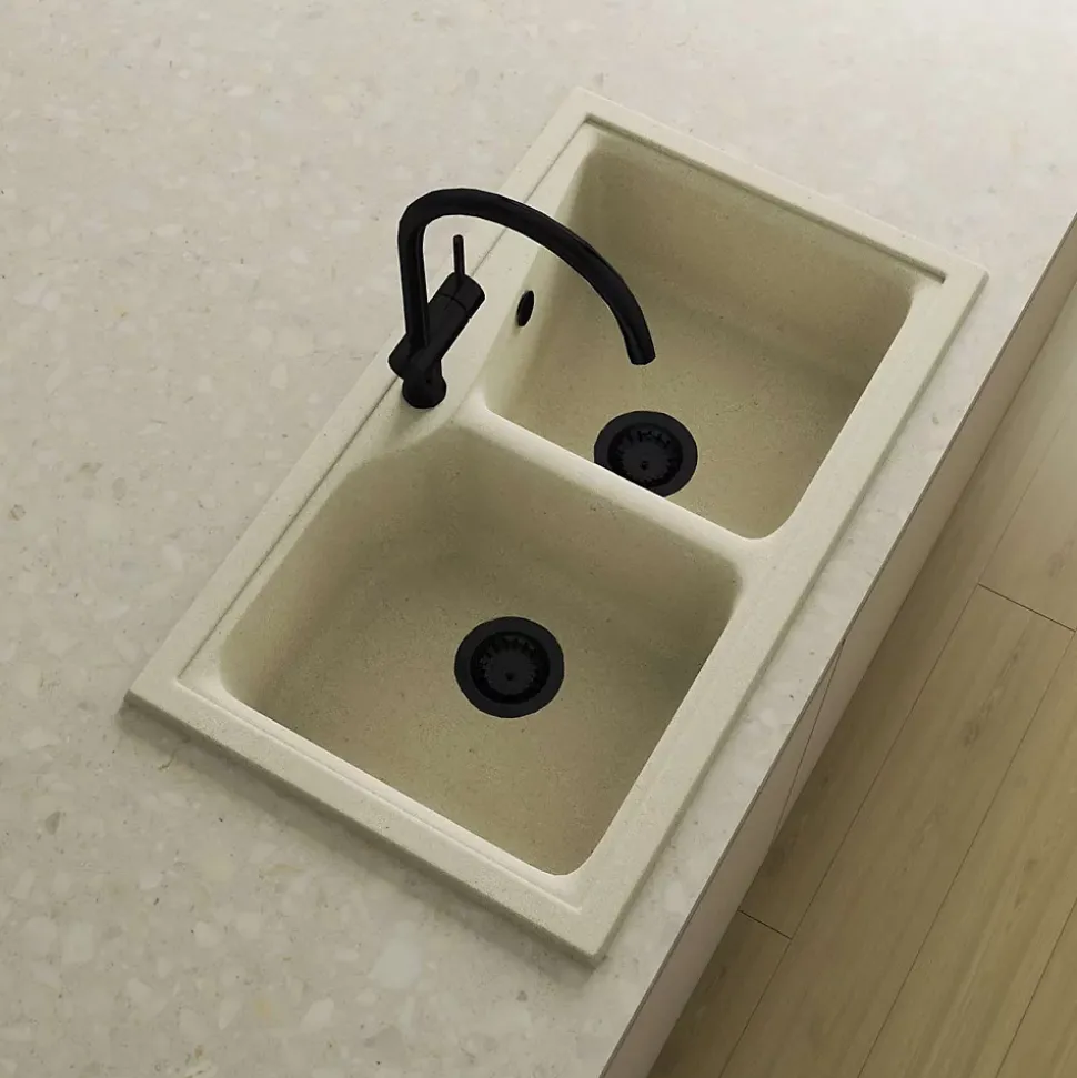 Pack évier à installation sur plan (à encastrer) avec deux cuves + un mitigeur avec douchette extractible + une bonde avec trop pleinRésistance aux rayures, à l’abrasion, à la chaleur (185°C), aux agents chimiques et aux colorants selon les tests UNE-EN 13310 -> Sans altérationLivré avec bonde manuelle carré, siphon et colle mastic.
