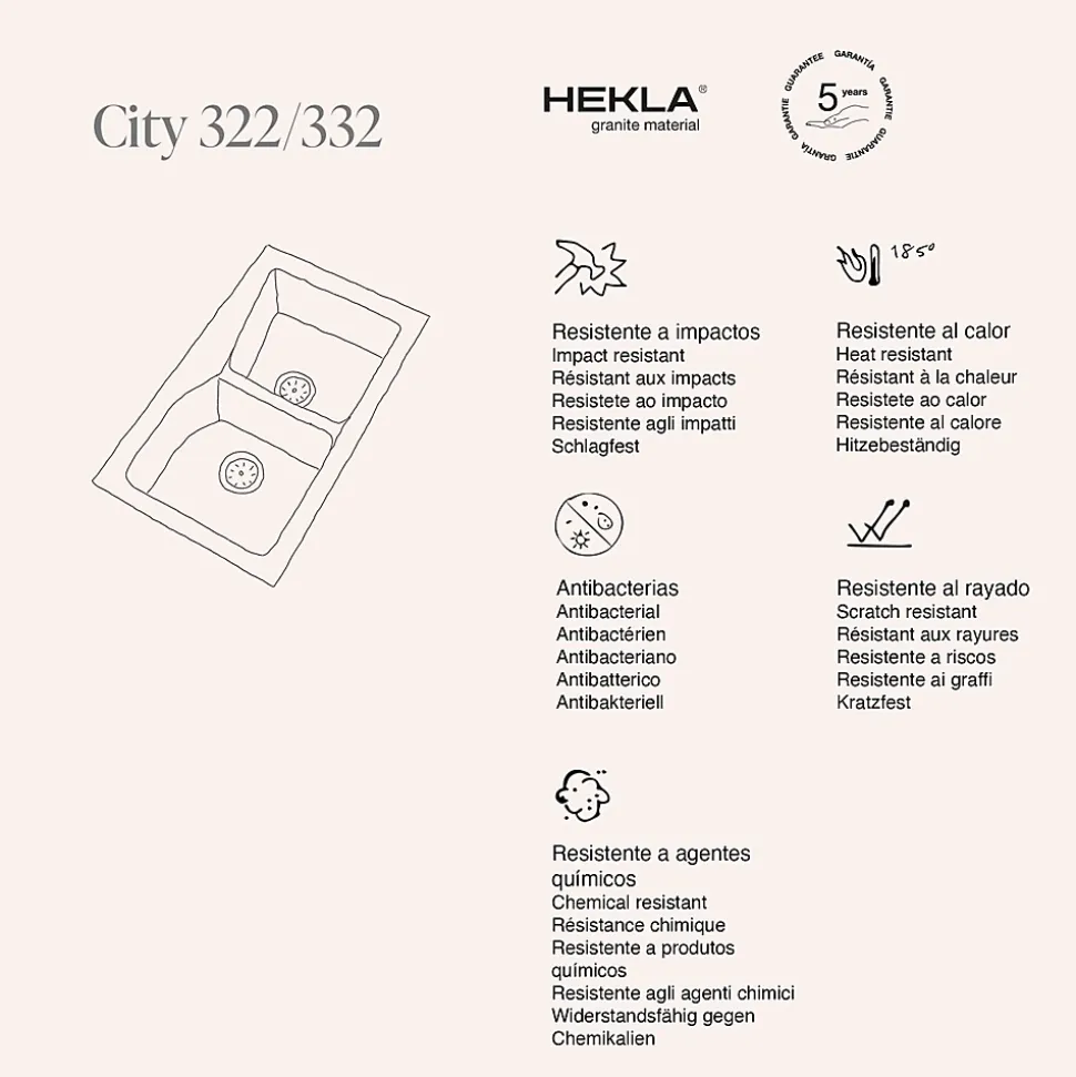 POALGI : fabricant espagnol depuis 1989 d’éviers et de receveurs de douche haut de gamme et de qualité pour les professionnels du sanitaire et les particuliers. Société certifiée ISO9001.La collection CitySimplicité et fonctionnalité. City constitue la gamme de produit la plus large des éviers Poalgi offrant une réponse à toute configuration et implantation de cuisine. Ses lignes courbes ajoutent une élégante simplicité à chaque composition. Poalgi propose de nombreuses finitions apportant adaptabilité et polyvalence quel que soit le style choisi.Le matériau HeklaHekla est le nouveau matériau de masse de Poalgi. Un matériau pour résister au passage du temps créé par un projet de recherche et développement dirigé par notre équipe ambitieuse, et approuvé par l’Institut Technologique AIDIMME. Inspiré par la bravoure des volcans, Hekla est un matériau compact composé de charges minérales dans différentes granulométries qui, avec la résine technique ajoutée, enveloppent chaque particule en obtenant un matériau unique et résistant. La technologie de dernière génération utilisée dans la fabrication des produits Hekla garantit la résistance à la charge, les dommages d’impact et les effets des températures élevées et basses, ainsi que la sécurité du transport, de l’installation et de l’utilisation quotidienne. Son traitement de surface empêche l’apparition de bactéries et son traitement V (anti-vieillissement) rend chaque produit Hekla en un véritable survivant au passage du temps.Le revêtement BactiblockCe procédé est un additif antimicrobien idéal pour une large variété de matériaux polymères. La technologie brevetée par la société NBM repose sur de l’argile fonctionnalisée avec de l’argent, laquelle va se comporter comme une source naturelle hautement efficace comme agent microbien. Cet additif inhibe le développement des bactéries de type champignon et levure, se convertissant ainsi en une solution efficace contre les odeurs et les tâches.