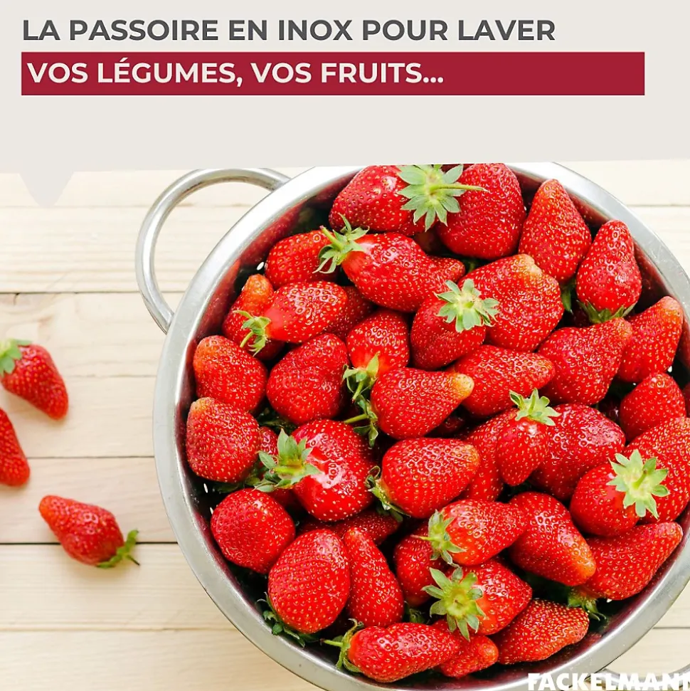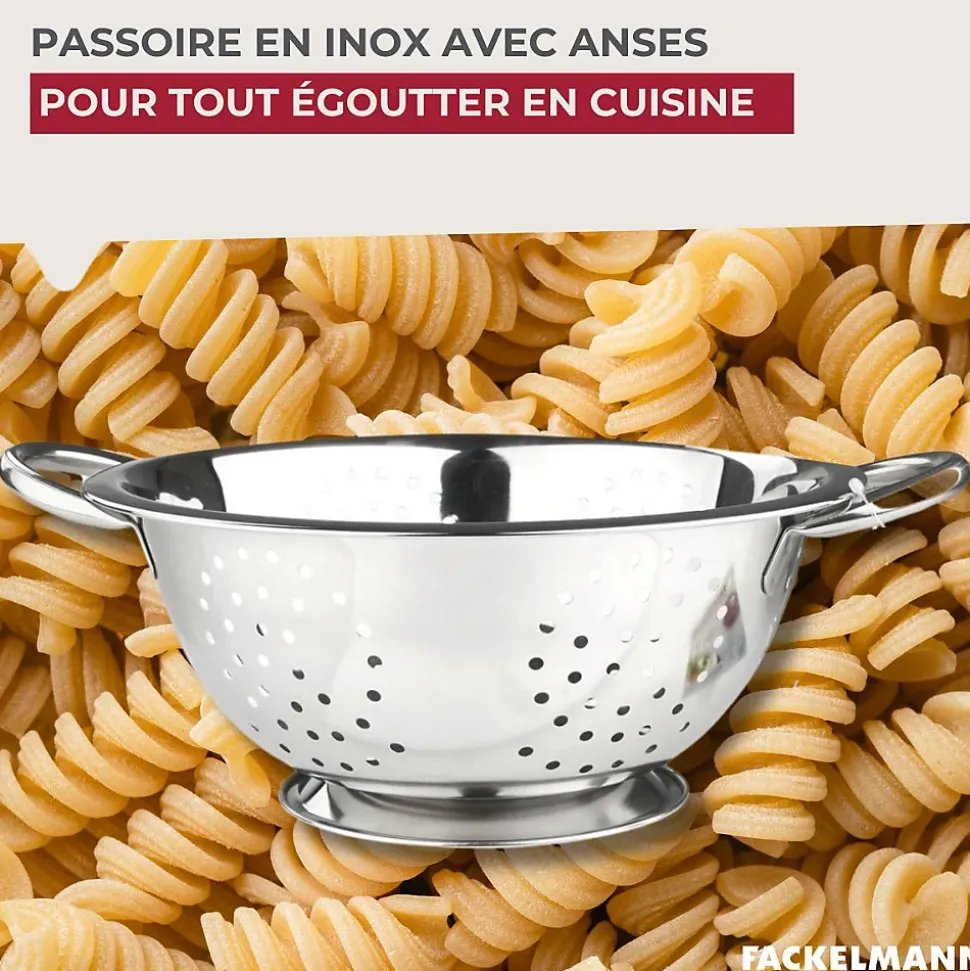 - DESCRIPTION : Fackelmann vous propose cette passoire en acier inoxydable, notre passoire possède deux anses afin d’être transportée facilement ; vous pouvez utiliser la passoire pour égoutter des fruits, des légumes, des pâtes, du riz