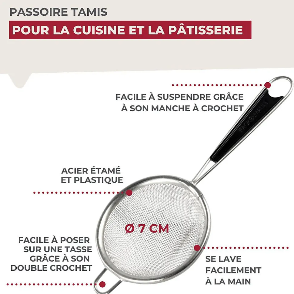 - ENTRETIEN : Ce tamis ne se met pas au lave-vaisselle, veillez à bien sécher la partie en acier après le nettoyage pour éviter les traces et la rouille.
