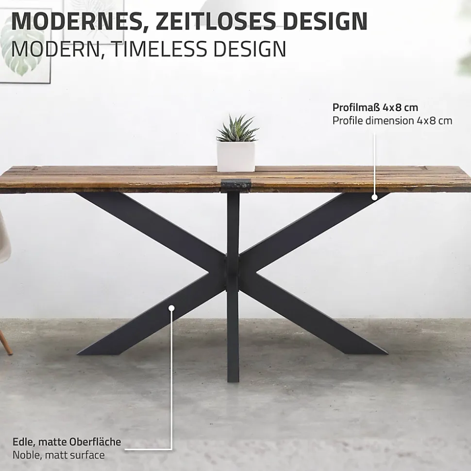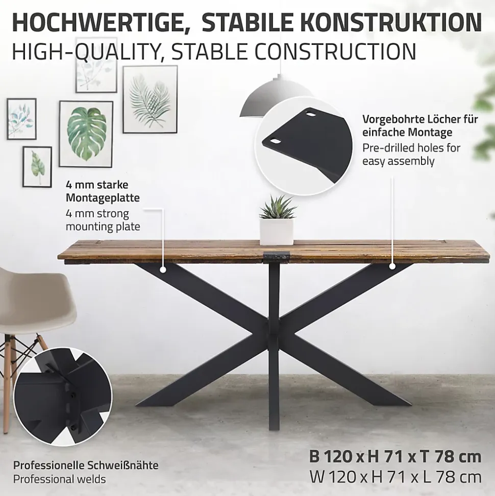 Livraison:1 x Pieds de tableInformation technique:Couleur: noirPoids: environ 18 kgMatériau: métal, revêtement en poudrePoints de fixation: 2 x 8Dimensions (LxHxP) : environ 78 x 71 x 120 cmÉpaisseur du matériau : environ 8 x 4 cmCaractéristiques:Haute qualitéMatériau antirouilleCaractère industrielProtection du sol incluseTrous pré-percés dans chaque piedConvient à tous les intérieursPeut supporter des articles jusqu’à 150 kgConstruction robuste et durableFabriqué en métal robuste, recouvert de poudrePour la cuisine, le salon, le bureau et bien plus encoreDescription:Ces pieds de table de ML-Design donnent à votre table un caractère industriel. Les pieds de table conviennent parfaitement comme base de table dans la cuisine, pour une table à manger ou un bureau. Ils sont fabriqués en acier revêtu de poudre et sont de haute qualité. Ainsi, une capacité de charge allant jusqu’à 150 kg est garantie.Les pieds de table tendance conviennent également à votre décoration intérieure moderne. Grâce à cet élément de design, vous créez une atmosphère fraîche pour votre intérieur. Construction très légère mais stable. L’aspect industriel stable, robuste et tendance est mis en valeur et, grâce à la simplicité de l’apparence, divers domaines d’application s’ouvrent.L’ensemble de la construction est non seulement stable mais aussi très esthétique. Nos pieds de table sont parfaits pour les plateaux de table faits d’une grande variété de matériaux, tels que le bois, le plastique, la pierre, etc. et le protecteur de sol inclus assure un support sûr et sans rayures sur le sol. Les trous pré-percés dans chaque pied rendent l’assemblage plus facile et plus pratique.