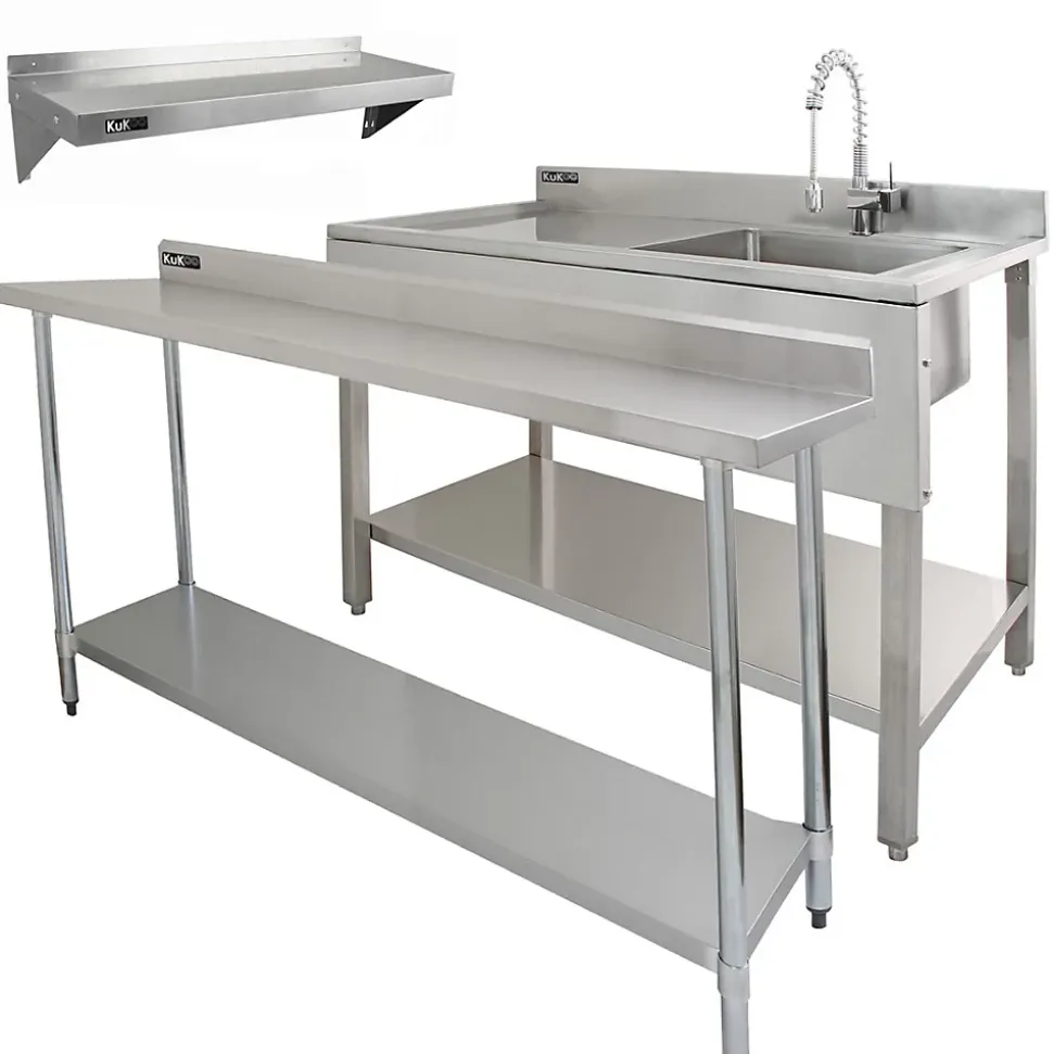 Chez MonsterShop, nous avons rassemblé le meilleur trio d’essentiels de cuisine commerciale pour vous proposer un ensemble incontournable comprenant un banc de restauration et un évier ainsi que deux étagères murales incroyablement pratiques.Notre table de restauration KuKoo mesure environ 180cm de large avec une capacité de poids de 250 kg sur deux étagères. Le banc est également une excellente option de rangement et vous permet d’avoir tout à portée de main pour donner vie à vos créations.Chacun des bords est complètement plat afin que les tables puissent être placées côte à côte ou contre des appareils comme le réfrigérateur.Le dosseret de 100 mm reposera également à plat contre le mur de la cuisine, la protégeant ainsi des éventuelles éclaboussures. Les caractéristiques réglables signifient que vous pouvez vraiment adapter chaque table commerciale parfaitement à votre cuisine. Tournez et corrigez simplement les pieds individuellement pour le maintenir stable sur des sols inégaux.Garder les choses organisées et bien rangées est facile grâce à l’étagère inférieure qui peut être déplacée vers le haut ou vers le bas des pieds de la table en fonction de ce que vous rangez.Les étagères murales robustes sont un incontournable absolu pour toute cuisine commerciale cherchant à tout garder propre et bien rangé.Idéales pour gagner de la place, ces étagères robustes sont idéales pour ranger tout ce qui se trouve dans votre cuisine occupée, comme le matériel de nettoyage, les ustensiles, la nourriture et bien plus encore. Rapides et faciles à assembler avec tout ce dont vous avez besoin pour construire et monter, ces étagères offrent une performance exceptionnelle jour après jour, parfaites pour les cuisines occupées.Nos éviers en acier inoxydable sont parfaits pour tout type de cuisine, en particulier les cuisines commerciales très fréquentées, car ils sont très faciles à nettoyer. De plus, le support haut de