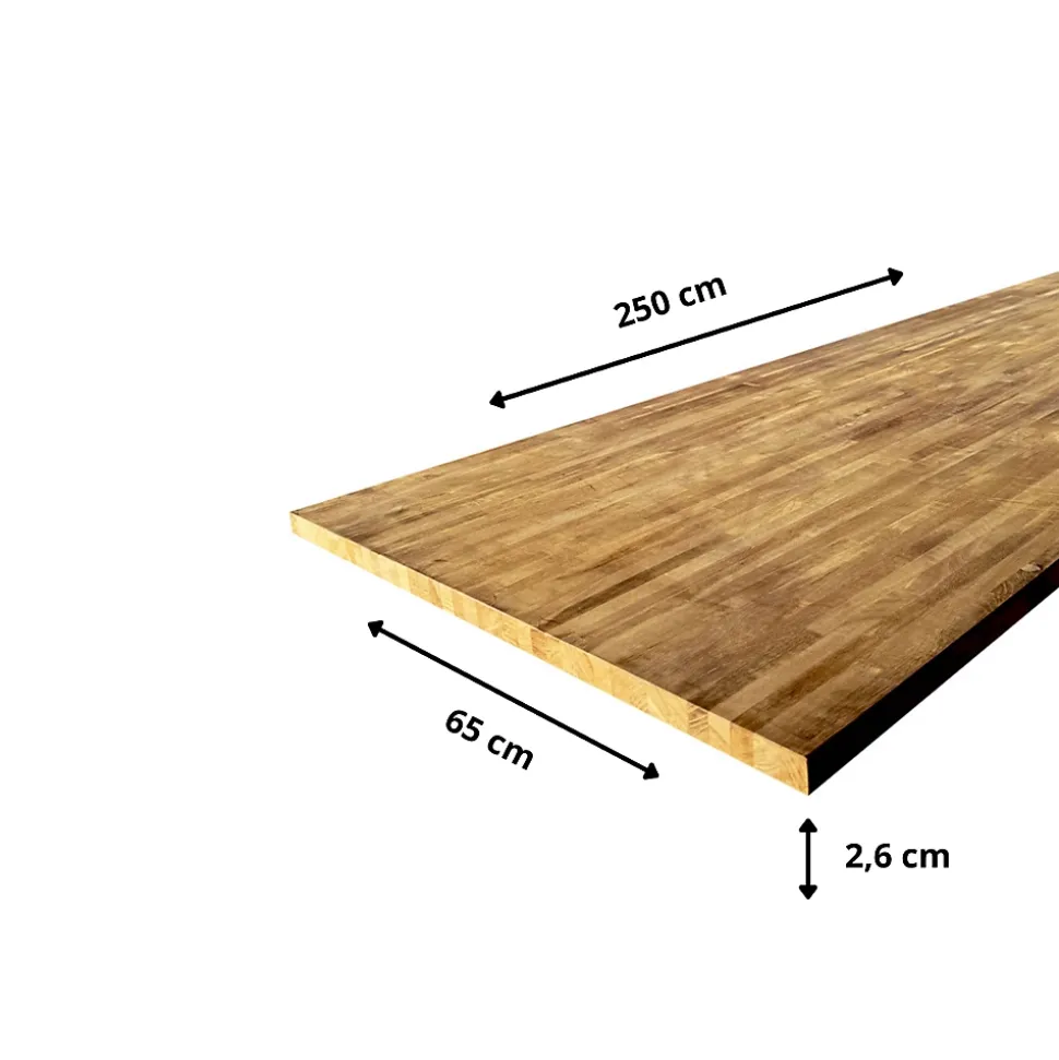 Plan de travail Teck.- Dimensions L.250 X P.65 cm, Ep.26 mm- Bois grande qualité.- Simple à entretenir.- A vernir ou huiler des 2 côtés avant usage pour protéger son aspect.- Pensez à laisser votre plan de travail s’acclimater à la pièce de destination pendant au moins 48 heures.- Plan de travail bois massif lamellé collé / abouté / enture côté / poncé.- Film individuel.- Facile à poser et à découper.- Idéal pour votre cuisine, salle de bain ou votre bureau.- Nos maitres mots sont qualité, disponibilité et réactivité.- Livraison rapide partout en France.