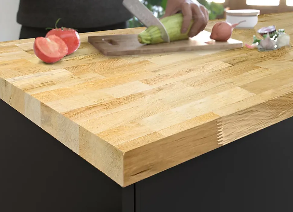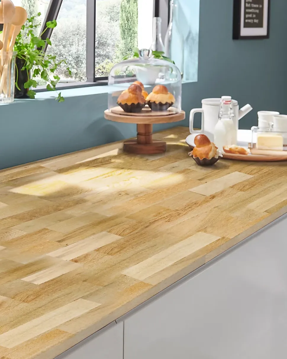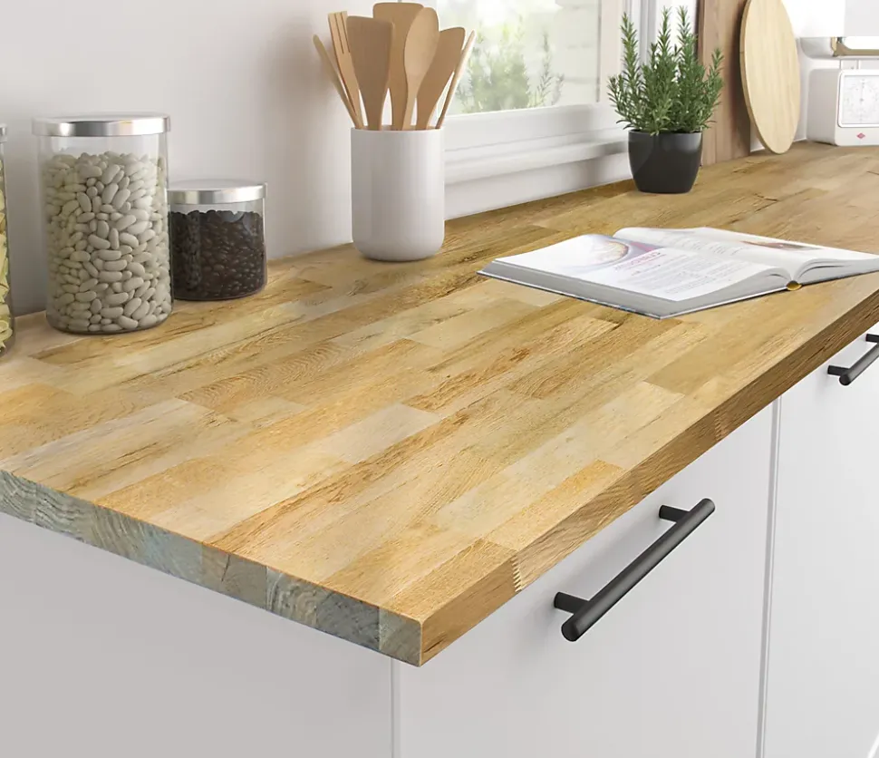 Idéal pour aménagement de la cuisine, bois lamellé collé, ambiance chaleureuse, entretien facile avec une huile adaptée