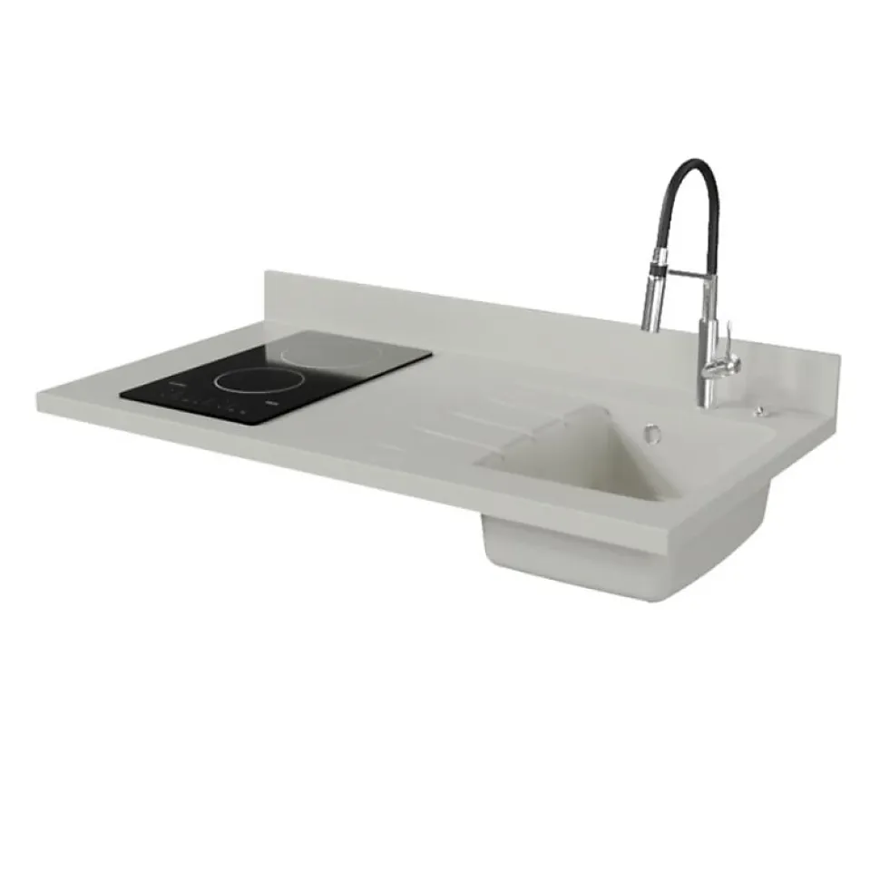 Plan de travail monobloc PlaniQuartz avec évier – 120 cm – Snova – évier à droite – Plaque de cuisson Vitrocéramique