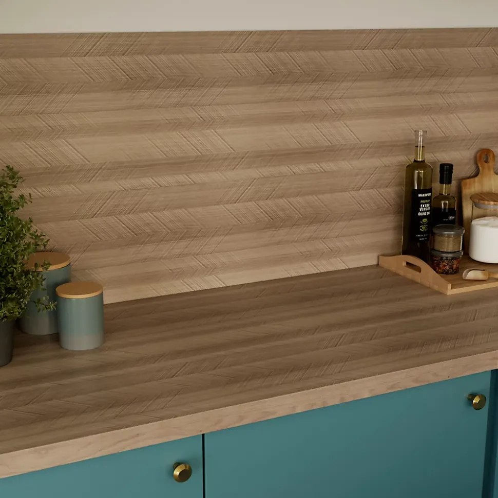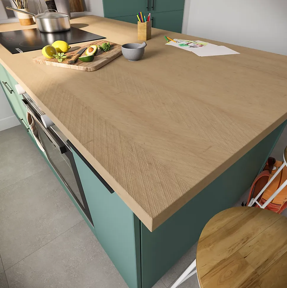 Plan de travail en stratifié aspect chevron chêne GoodHome Berberis L. 300 x P. 62 x ép. 3,8 cm