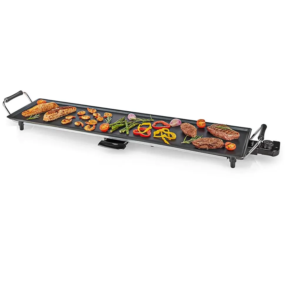 Plancha teppanyaki 1800w 90×23 cm Nedis – Avec plaque de grill de Nedis FCTE110EBK90, faites cuire vos aliments préférés avec cette plancha teppanyaki. Elle est équipée d’un thermostat réglable pour préparer toutes sortes de légumes, viandes et poissons à la perfection. La plancha dispose également d’un plateau récupérateur coulissant, pour une expérience culinaire à faible teneur en matière grasse.Un cordon d’alimentation amovible et un revêtement antiadhésif vous permettent de nettoyer l’appareil en un rien de temps. – Type de produit : Plancha.Puissance : 1800 W.Consommation électrique maximale : 1800 W.Tension d’entrée : 230 V AC 50 Hz.Matériau : Métal.Voyant : Oui.Type de source d’alimentation : Alimentation secteur.Fiche d’alimentation : Type F (CEE 7/7).Longueur du câble d’alimentation : 0.90 m.Collecteur de graisse amovible : Oui.Nombre de réglages de chaleur : 5 Réglages de Chaleur.Couleur : Noir.Surface de cuisson (l x l) : 90 x 23 cm.Largeur : 1015 mm.Hauteur : 113 mm.Profondeur : 265 mm.Taille (LxPxH) : 102.5 x 26 x 10.5 cm.Poids : 2870 g.