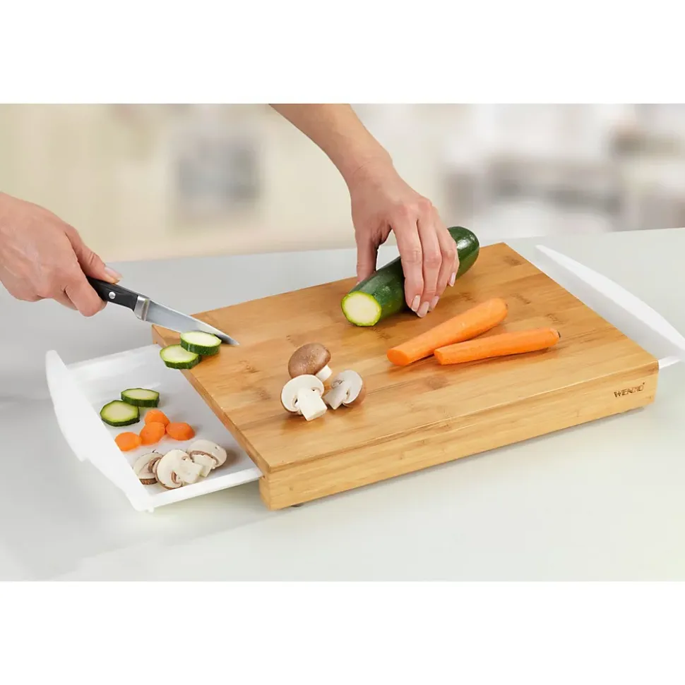 Cette planche tendance en bambou est idéale pour découper vos aliments ou pour présenter vos préparations culinaires. Equipée de tiroirs facilitant le collecte des déchets.FICHE TECHNIQUE- Planche à découper en bambou.- Tiroirs en polypropylène.- Pieds en silicone.- Planche à découper pour les fruits, les légumes, les poissons et les viandes.- Equipée de deux récipients de collecte amovibles.- Avec quatre pieds antidérapants pour un travail en toute sécurité.CARACTERISTIQUES TECHNIQUES- Dimensions : L. 40,5 x l. 25 x H. 4 cm.- Poids : 1,21 kg.