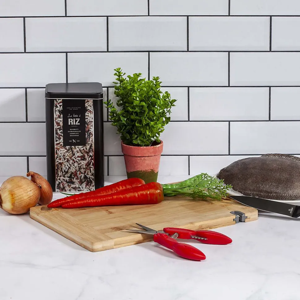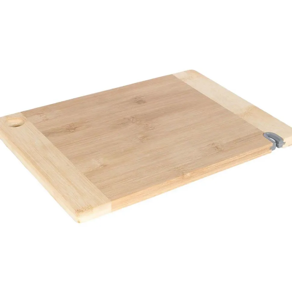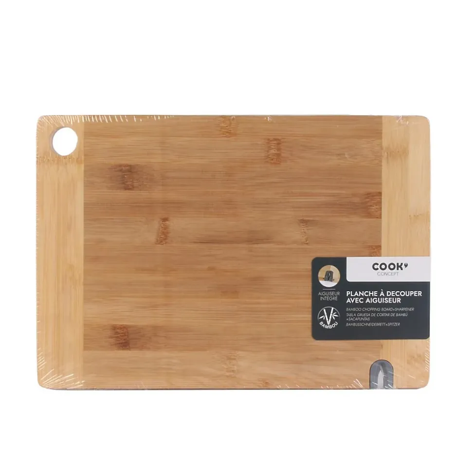 Aspect : Matériau principal = Bambou • Dimensions : Hauteur (en cm) = 1,70 • Longueur (en cm) = 33,10 • Profondeur (en cm) = 23,10 • Autres caractéristiques : Informations complémentaires = Avec aiguiseur intégré • Poids (en kg) = 0,82 • Planche à découper en bambou avec aiguiseur intégré