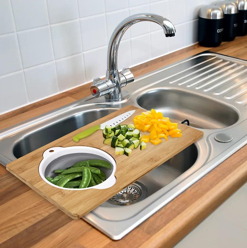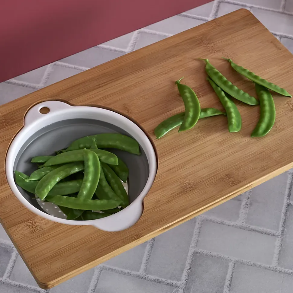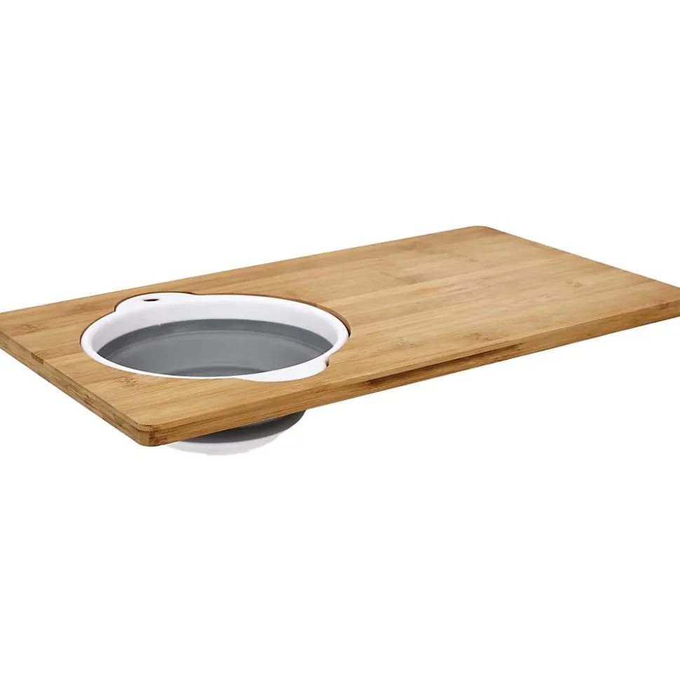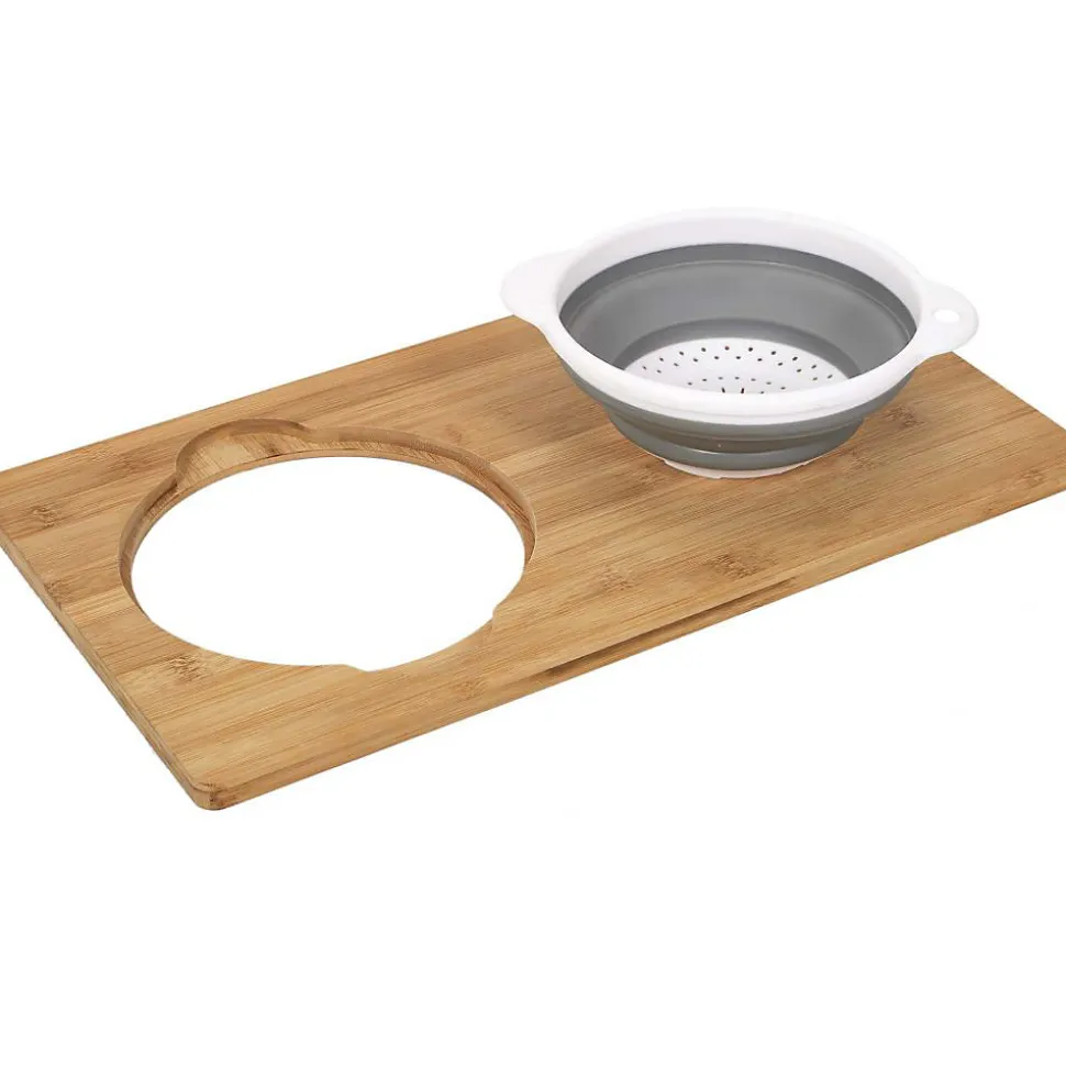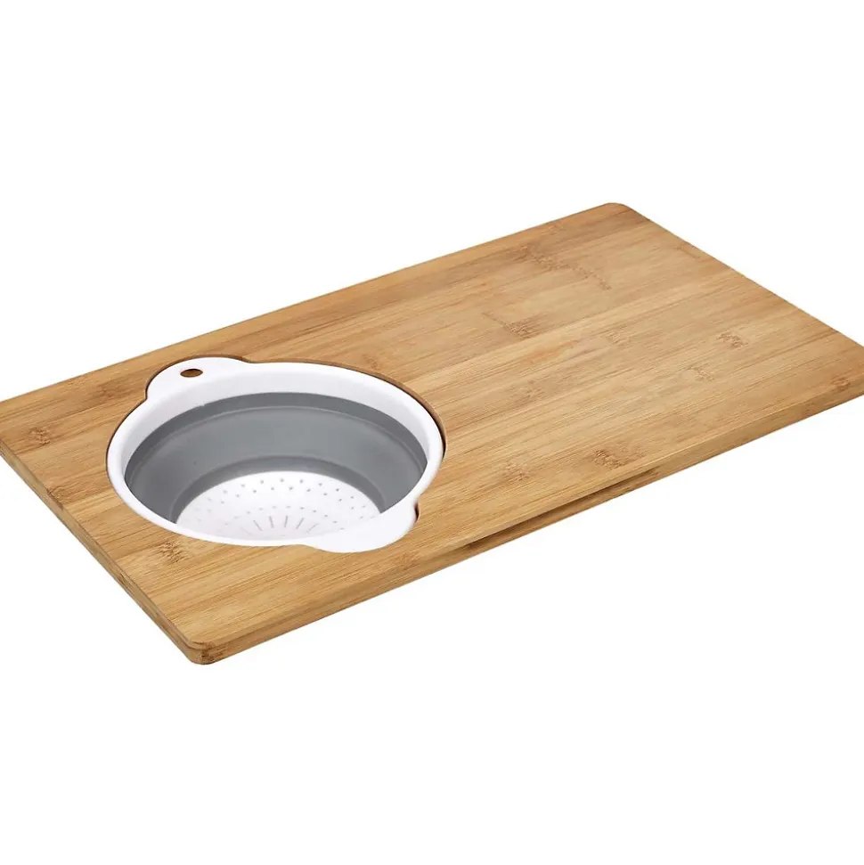 Aspect : Matériau principal = Bambou • Matériaux secondaires = Silicone • Dimensions : Hauteur (en cm) = 2 • Longueur (en cm) = 49,50 • Profondeur (en cm) = 29,50 • Autres caractéristiques : Informations complémentaires = Passoire amovible intégrée • Poids (en kg) = 1,12 • Planche à découper en bambou avec passoire intégrée