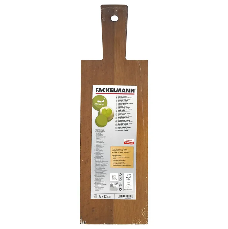 DESCRIPTION : Planche à découper rectangulaire en bois pour couper du saucissonLE PETIT + : Cette petite planche à découper en bois est idéalement conçue pour couper des légumes comme des aubergines ou des courgettes mais aussi toute sorte d’alimentsCOMPOSITION : Bois, certifié par FSCDIMENSIONS : 39 x 12 cmCONTENU : 1 planche à découper brun foncé rectangleLa planche à découper est un ustensile de cuisine basique que tout le monde doit posséder. Pour beaucoup de recettes, même la plus simple, vous aurez besoin d’une planche à découper, souvent en bois, afin de ne pas abîmer votre plan de travail.Non seulement la planche à découper protège votre cuisine des coups de couteaux mais elle est parfaite pour présenter vos apéritifs. Vous pouvez couper toute sorte de choses sur une planche en bois notamment les légumes, les oignons, les herbes aromatiques, l’ail, la viande, le poisson, le saucisson etc.Cette planche à découper rectangulaire peut aussi servir de planche à pain pour couper et/ou présenter votre pain, pour coupe une brioche ou un gâteau également.Fackelmann France est une entreprise spécialisée dans la distribution d’ustensiles de cuisine et de pâtisserie ainsi que de moules à gâteaux et de plaques de cuisson. L’entreprise tente d’apporter une certaine facilité dans la façon de cuisiner de chacun grâce à ses ustensiles malins.Les ustensiles de cuisine de Fackelmann France sont proposés à tous les profils de cuisiniers pour une utilisation simple et quotidienne. Les fouets, spatules, louches, éplucheurs, planches à découper et bien d’autres sont à votre portée afin de préparer de délicieuses recettes toujours plus originales.