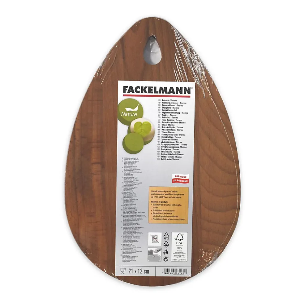 DESCRIPTION : Planche à découper ovale en boisLE PETIT + : Originale par sa forme, cette planche à découper vous permettra de présenter vos apéritifs avec éléganceCOMPOSITION : Bois, certifié par FSCDIMENSIONS : 21 x 12 cmCONTENU : 1 petite planche à découper ovaleLa planche à découper est un ustensile de cuisine basique que tout le monde doit posséder. Pour beaucoup de recettes, même la plus simple vous aurez besoin d’une planche à découper, souvent en bois, afin de ne pas abîmer votre plan de travail.Non seulement la planche à découper protège votre cuisine des coups de couteaux mais elle est parfaite pour présenter vos apéritifs. Vous pouvez couper toute sorte de choses sur une planche à découper notamment les légumes, les oignons, les herbes aromatiques, l’ail, la viande, le poisson, le saucisson etc.Cette planche à découper ovale peut aussi servir de planche à pain pour couper et/ou présenter votre pain, pour coupe une brioche ou un gâteau également. La forme originale de la planche à découper vous permet de présenter vos apéritifs sous forme de toasts ou de verrines.Fackelmann France est une entreprise spécialisée dans la distribution d’ustensiles de cuisine et de pâtisserie ainsi que de moules à gâteaux et de plaques de cuisson. L’entreprise tente d’apporter une certaine facilité dans la façon de cuisiner de chacun grâce à ses ustensiles malins.Les ustensiles de cuisine de Fackelmann France sont proposés à tous les profils de cuisiniers pour une utilisation simple et quotidienne. Les fouets, spatules, louches, éplucheurs, planches à découper et bien d’autres sont à votre portée afin de préparer de délicieuses recettes toujours plus originales.