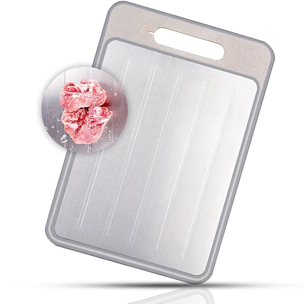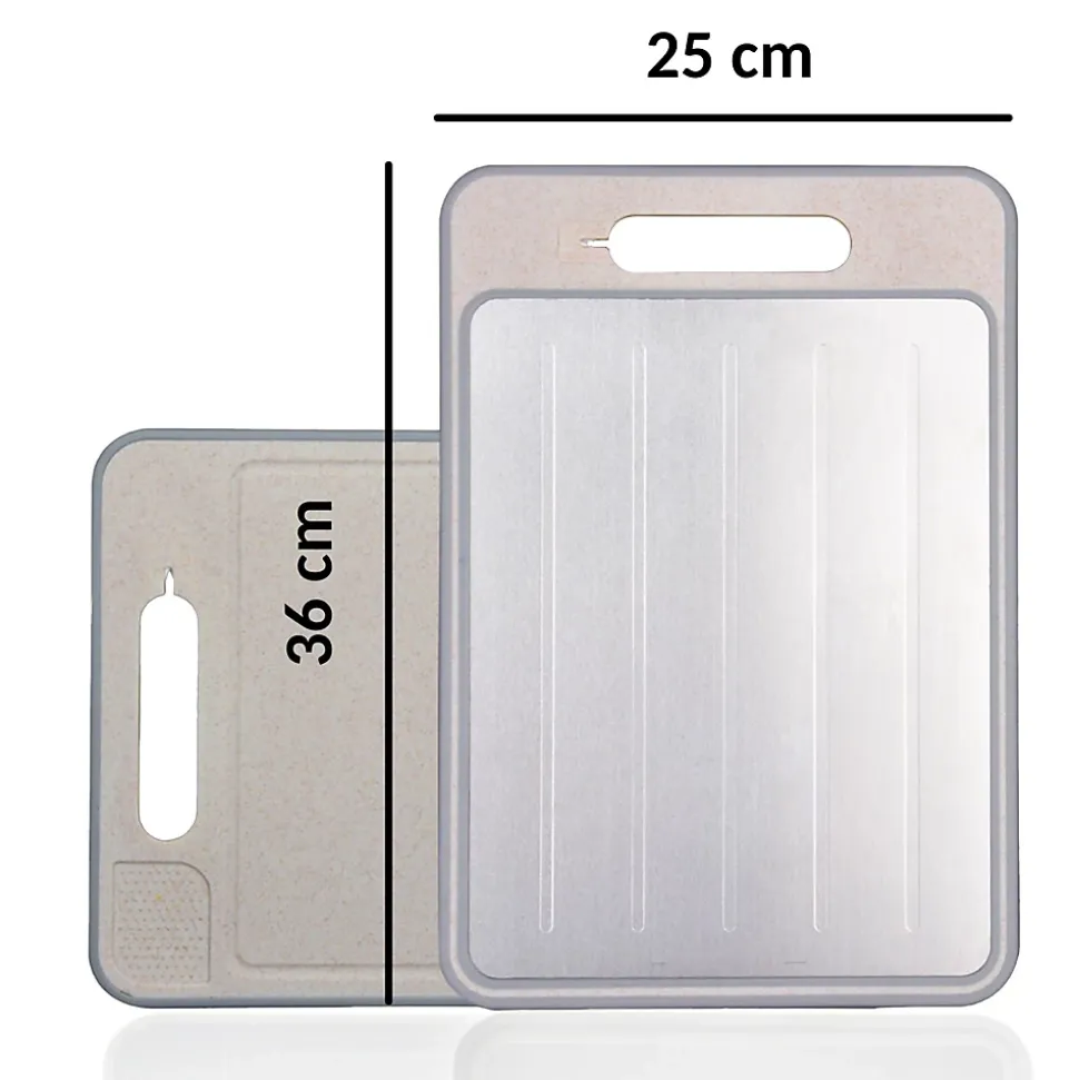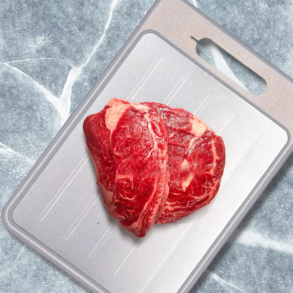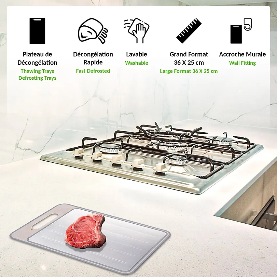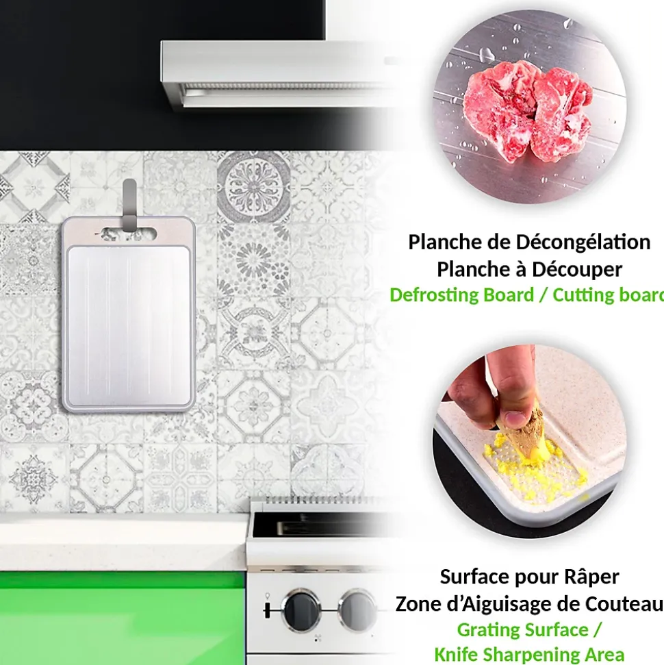 – DECONGELE – Une face de la planche est réservée à la décongélation. Elle est recouverte d’une plaque en aluminium qui permet de décongeler vos aliments en un temps record tout en en préservant les saveurs. – RAPER – Dans un angle se trouve un espace pour gratter ail, le zest d’un citron ou encore du gingembre. Pratique, la planche dispose d’une rigole d’écoulement et d’une poignée pour une utilisation et un rangement facile. – DECOUPAGE – L’autre face est dédiée à la préparation de vos aliments. Elle est constituée d’une grande planche à découper en plastique résistant mais respectueux de vos lames. – AUGUISEUR – Astuce supplémentaire, un aiguiseur se cache dans le creux de la poignée, vous permettant d’affûter votre lame avant de découper vos aliments. – CARACTERISTIQUES – Matières : Aluminium, Plastique TPR, – Dimension : 25.1 X 36.5 X 1 cm – Poids 0.700 Kg – Certifiée LFGB sur les deux surfaces – Livrée sous polybag