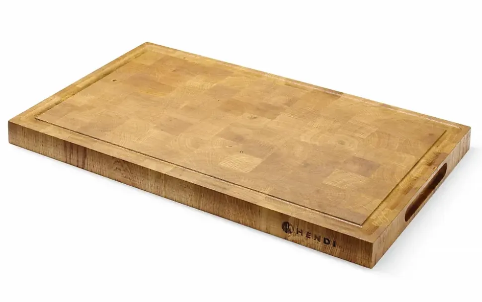 La planche de présentation en chêne HENDI, bois de bout, est de première qualité et résistante. Chaque planche est fabriquée en partie à l’aide de machines à bois professionnelles et en partie à la main par des artisans expérimentés. Sa taille et ses caractéristiques la rendent idéale pour créer de belles planches à charcuterie. Elle peut également être utilisée pour servir des plats savoureux tels que des steaks et des hamburgers. Fabriquée selon la méthode du bois de bout, la durabilité de la planche est garantie. De plus, elle n’émousse pas les couteaux, car la lame se glisse entre les fibres du bois.. Bois de chêne de haute qualité. Méthode de construction en bout de bois pour une résistance maximale. Préserve les couteaux, évite leur émoussement. Avec motif en damier et rigole. Deux côtés avec poignées profilées Deux côtés.Fabriqué selon la méthode du bois de bout : des carrés de chêne sont collés les uns aux autres selon un élégant motif en damier.Placement vertical des fibres de bois, perpendiculairement à la surface de travail – durabilité accrue, résistance aux rayures et prévention de l’émoussement des couteaux (la lame passe entre les fibres du bois).En bois de chêne huilé de première qualité, très dense et massif – résistant aux chocs et aux rayures.Huilé avec une huile adaptée au contact alimentaire – prolongeant la longévité et les qualités visuelles du bois naturel.Avec 2 poignées profilées (poignées fraisées) – peut être facilement déplacé malgré sa taille.Un côté avec rigole pour éviter que les liquides ne s’écoulent sur le plan de travail.Ne convient pas au lave-vaisselle.Entretien régulier du bois à l’aide d’une huile naturelle sans danger pour le contact alimentaire.