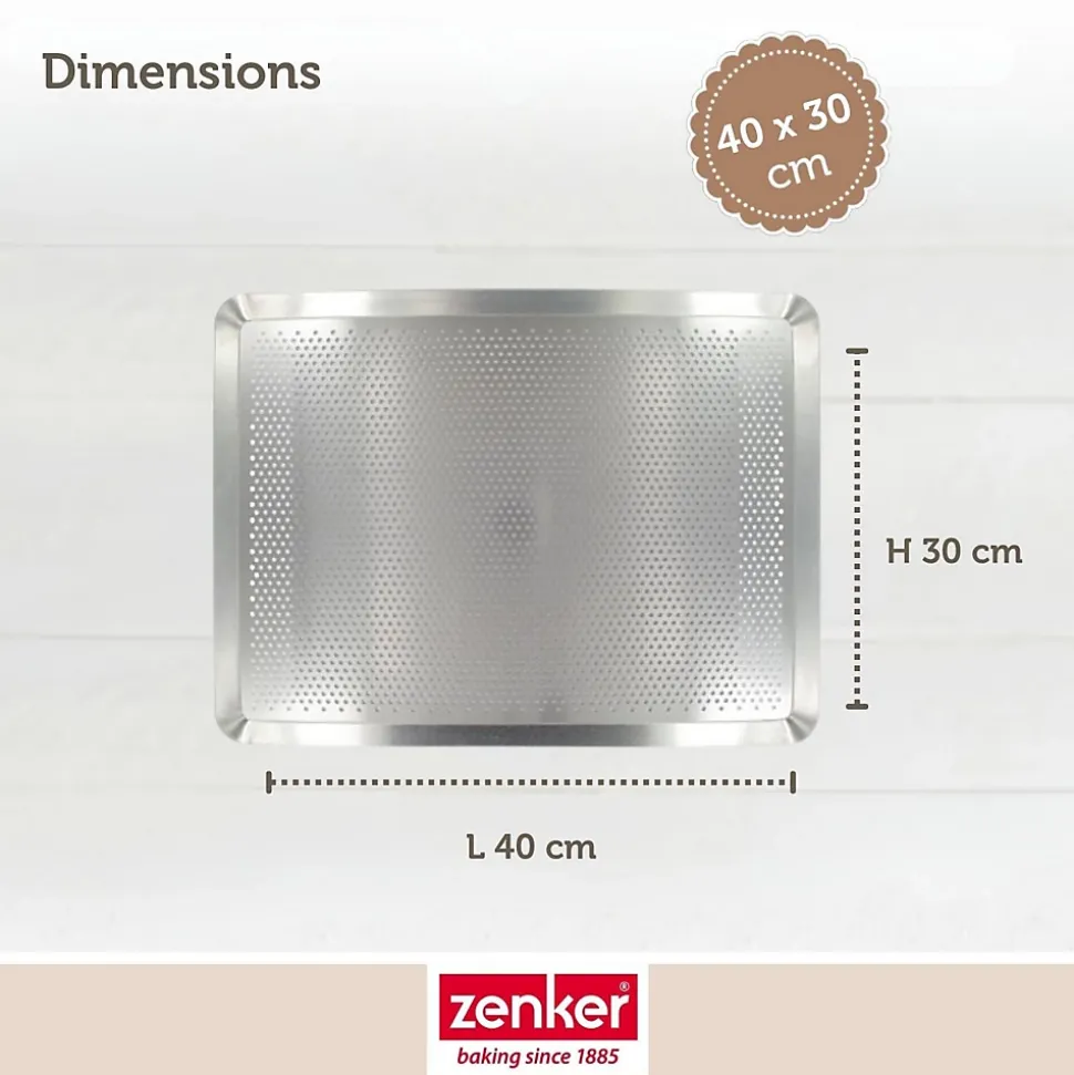 DESCRIPTION : Zenker vous propose cette plaque à pâtisserie faite en acier inoxydable 18/10 de haute qualité LE PETIT + : Son fond perforé laisser circuler l’air et permet à l’humidité de s’échapper, pour une cuisson idéale COMPOSITION : En aluminium, résistant à une température de 280°C ; à laver à la main DIMENSIONS : 40 x 30 x 1,5 cmUTILISATION : Cette plaque est idéale pour cuire vos sablés de Noël et petits biscuits de toute sorte, vos pains, pizzas et flammkueche, ainsi que les légumes grillés et pommes de terre au fourLe plus grand plaisir de la pâtisserie… …c’est quand ce qui sort du four est non seulement délicieux, mais a l’air tout aussi tentant.Et parce que chez Zenker nous sommes passionnés par la dégustation de délicieuses friandises, nous développons et produisons des moules et des accessoires bien pensés. Zenker vous propose cette plaque à four perforée en acier inoxydable 18/10 de haute qualité. Avec ce produit, vous pourrez facilement préparer des biscuits, des pizzas, du pain, ou encore des légumes grillés et des pommes de terre au four. Passe au four jusqu’à 280°C maximum.Dimensions : 40 x 30 x 1,5 cm