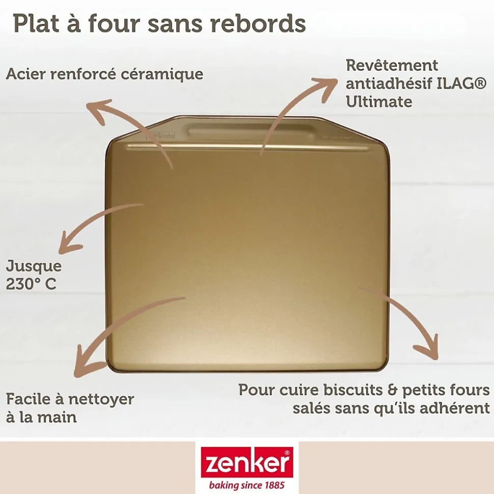 - DESCRIPTION : Zenker vous propose ce plat à four sans rebord en acier inoxydable renforcé céramique avec revêtement anti-adhésif, pour faire glisser facilement à la sortie du four vos biscuits de Noël, cookies, macarons et meringues