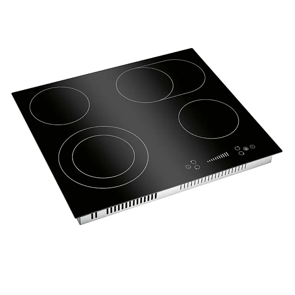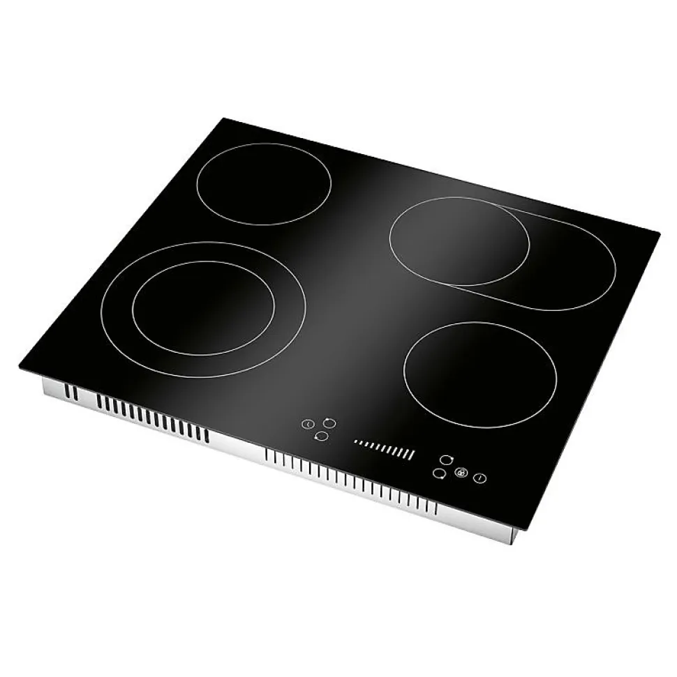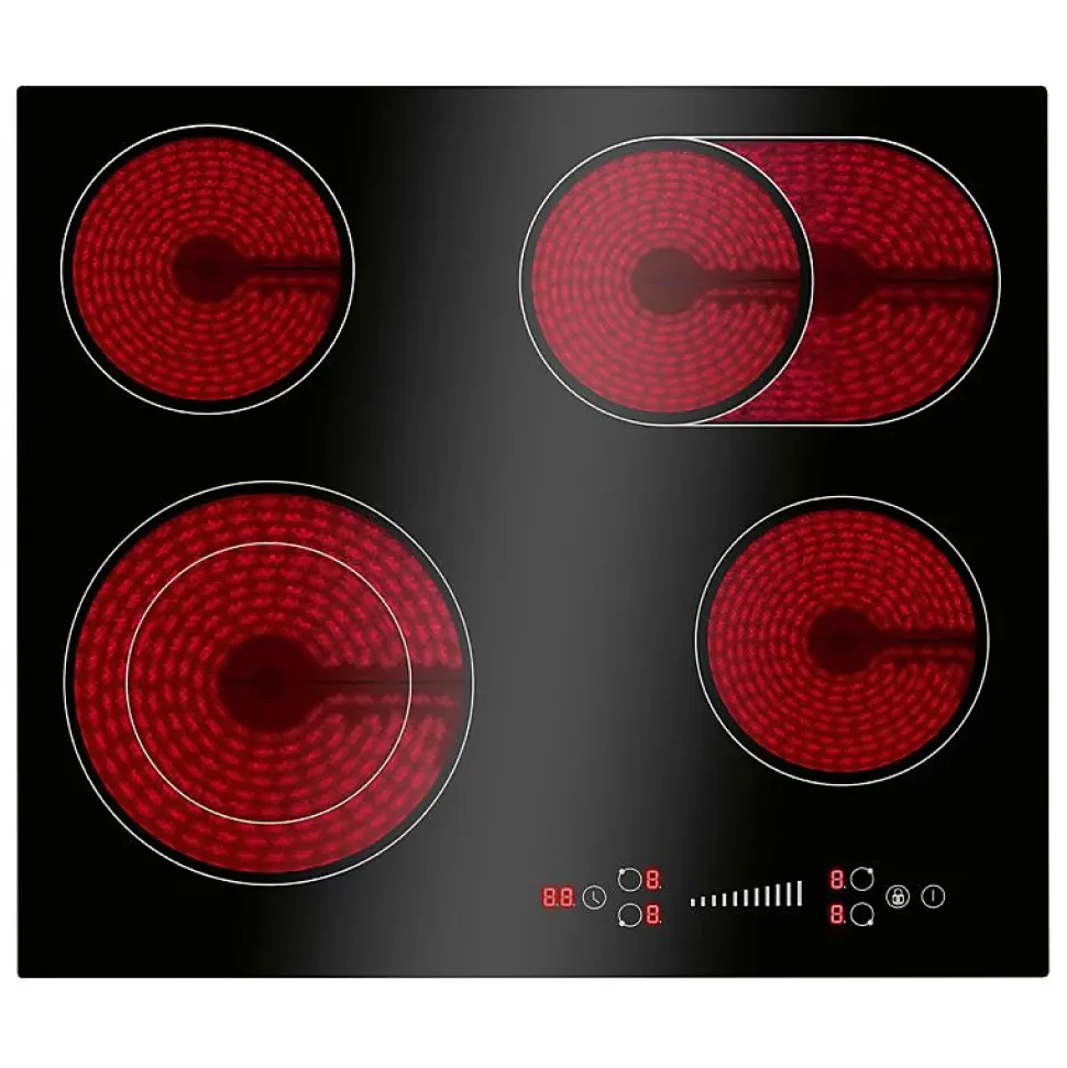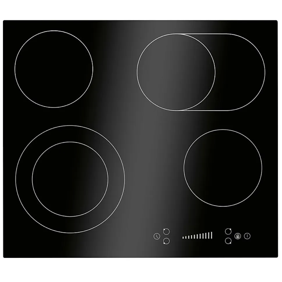 SpécificationsPlaque de cuisson vitrocéramique Autarkic, largeur 60 cm4 zones de cuisson2* Zone simple : Ø165 mm / 1200 W1* Double zone : Ø160/230 mm / 1000/1200 W1* Zone ovale : Ø165/270 mm / 1100/2000 WAffichage numérique des niveaux de cuisson et des fonctions de la minuterieFonctionnement par capteur « commande par effleurement/glissade ».9 niveaux de puissanceFonction minuterie 1 – 99 minutesArrêt automatique de la cuisson pour chaque zone de cuisson(peut être utilisé simultanément)Sécurité enfantsIndicateur de chaleur résiduelleProtection contre la surchauffeInterrupteur de sécuritéConception sans cadreCâble de raccordement inclusMesure intégrée (découpe)56,0 x 49,0 cm (L x P)Données techniquesTension de raccordement : 380-420 V 2N~ 50-60 HzConnexion à 2 phases (haute tension)Puissance nominale : 6600 WCourant nominal : 2 x 16 A