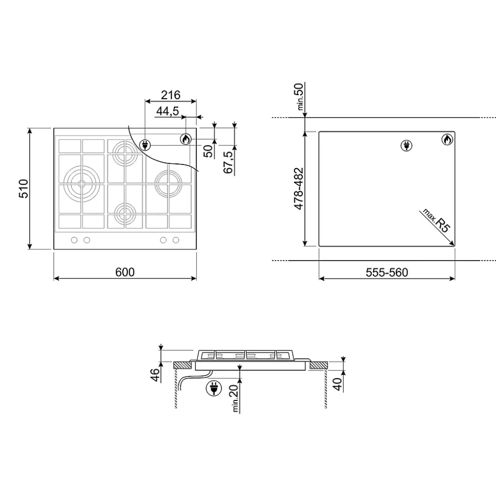 Plaque de cuisson gaz 4 foyers Smeg coloris argent l. 60 x P. 51 x H. 4,2 cm