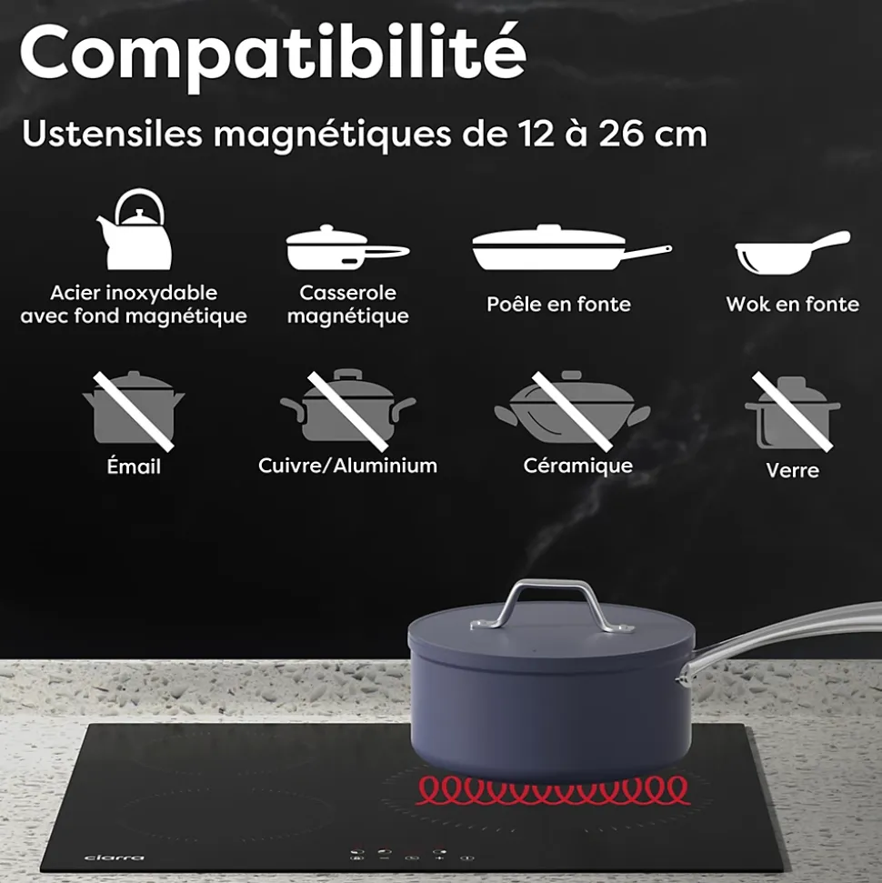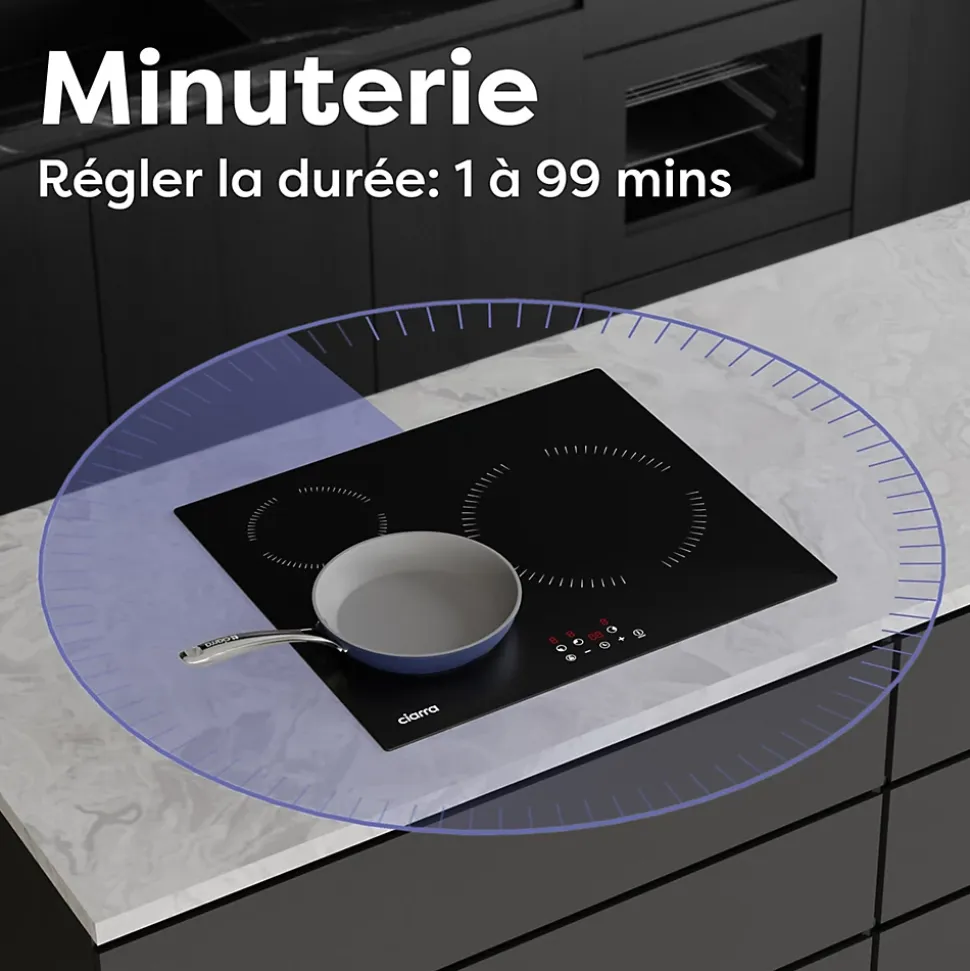 Modèles: CD3BIH-APanneau Givré Légèrement BrillantType : Plaque à induction encastrableNombre de foyer:3 feuxNiveaux de Puissance: 9Puissance totale: 5600 WattBooster: NonCommande: Touche Sensitive avec Affichage DigitalPrise:San priseAlimentation : 220-240V ~ 50-60HzDimensions (LxPxH) : 59 x 52 x 6.2 cmDimensions d’encastrement : 56 x 49 x 8 cmPuissance et diamètre des zones :Zone Avant Gauche: 180mm,1800W (Compatible avec les casseroles de fond de 140-260mm)Zone Arrière Gauche: 160mm,1200W (Compatible avec les casseroles de fond de 120-200mm)Zone Arrière Droite: 280mm,2600W (Compatible avec les casseroles de fond de 180-300mm)Fonctions :Minuterie individuelle pour chaque foyer (jusqu’à 99 minutes)Verrouillage enfantIndicateur de chaleur résiduelle (« H »)