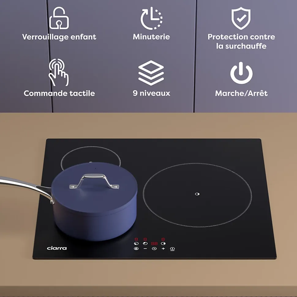 La plaque induction CD3BIH-E est idéale pour une cuisson quotidienne efficace :Puissance totale 5600W : Répartition équilibrée sur 3 zones (1800W/1200W/2600W).Protection complète : Verrouillage enfant, sécurité anti-débordement et détection automatique les casserolesDimensions compactes : 590x520x62mm, intégration harmonieuse dans votre cuisine.