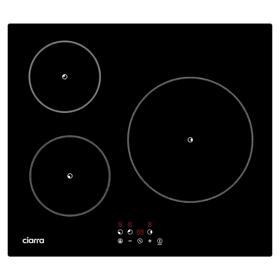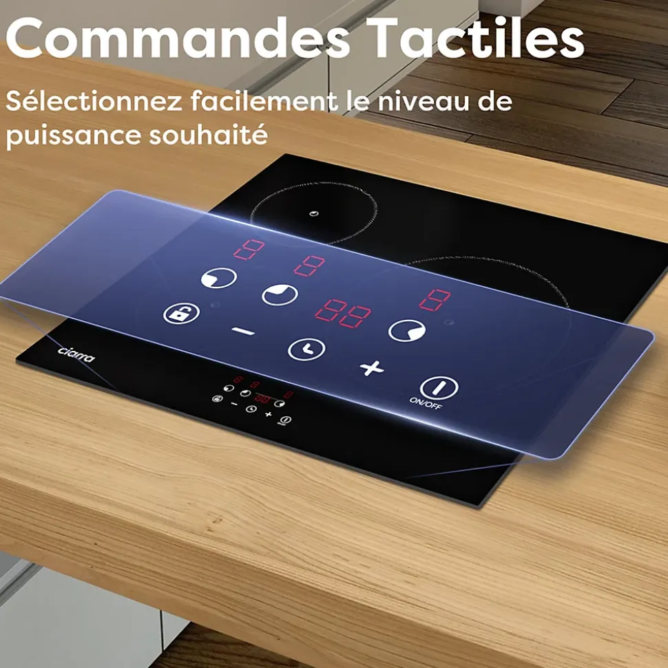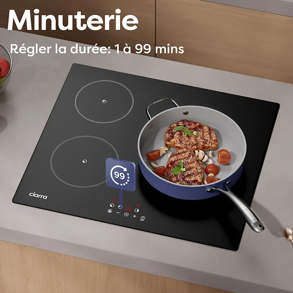 Modèles: CD3BIH-F Type : Plaque à induction encastrableNombre de foyer:3 feuxNiveaux de Puissance: 9Puissance totale: 5600 WattBooster: NonCommande: Commande Tactile avec Affichage DigitalPrise:San priseAlimentation : 220-240V ~ 50-60HzDimensions (LxPxH) : 59 x 52 x 6.2 cmDimensions d’encastrement : 56 x 49 x 8 cmPuissance et diamètre des zones :Zone Avant Gauche: 180mm,1800W (Compatible avec les casseroles de fond de 140-260mm)Zone Arrière Gauche: 160mm,1200W (Compatible avec les casseroles de fond de 120-200mm)Zone Arrière Droite: 280mm,2600W (Compatible avec les casseroles de fond de 180-300mm)Fonctions :Minuterie individuelle pour chaque foyer (jusqu’à 99 minutes)Verrouillage enfantIndicateur de chaleur résiduelle (« H »)