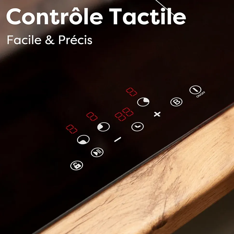 - Commande tactile : Un interrupteur tactile sensible offrant un contrôle précis et facile de la puissance de cuisson.