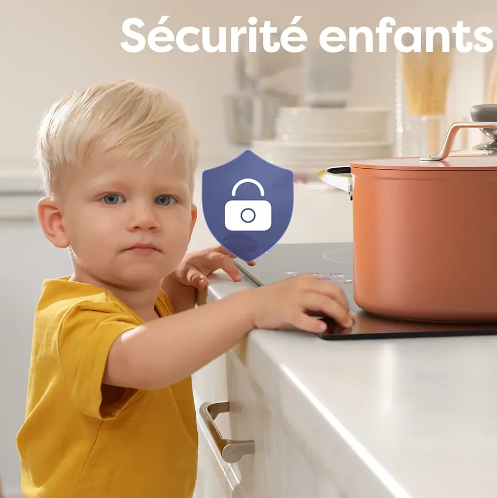 Verrouillage enfant pour éviter les manipulations accidentelles.Entretien simplifié : Surface en verre résistante aux chocs et rayures.Précision de cuisson : 9 niveaux de puissance ajustablesDétection automatique des ustensilesMinuteur programmable indépendante par zone.Technologie induction avec rendement énergétique jusqu’à 90%.