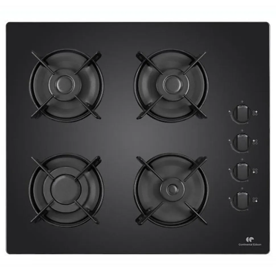 Table de cuisson au gaz CONTINENTAL EDISON avec 4 foyers. Surface en verre trempé noir. Dimensions: 59,4 cm de largeur, 4,4 cm de hauteur et 52,3 cm de profondeur. Poids: 9,5 kg. Allumage électronique. Dimensions d’encastrement 56*49cm. Injecteurs gaz de ville montés, injecteurs gaz bouteille inclus dans le colis.