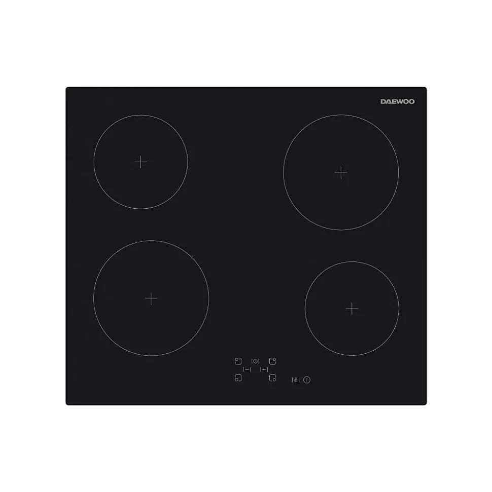 Plaque vitrocéramique encastrable Daewoo 60 cm noire, 4 foyers, 6000 W, commandes tactiles, 9 niveaux, minuterie et fonctions Booster et Powerbreak.