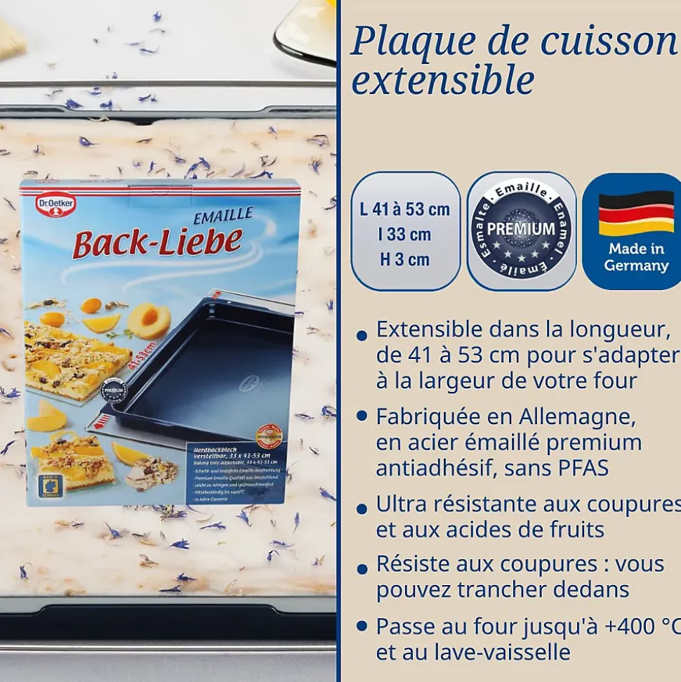 Dr Oetker vous propose cette plaque de cuisson rectangulaire pour le four qui est universelle et extensible pour s’adapter à votre four, que ce soit un mini four ou un four encastrableLa plaque pour four extensible est parfaite pour cuire des plats au four mais elle peut également vous servir de plaque genoise pour réaliser des gâteaux roulésCette plaque four est fabriquée en acier avec un revêtement émaillé antiadhésif si résistant que la plaque peut passer au lave-vaisselle et passe au four jusqu’à 400°CLa plaque pour four est extensible dans la longueur de 41 à 53 cm pour s’adapter à la largeur de votre four, elle mesure 33 cm de profondeur et 3 cm d’épaisseurLa plaque de four peut être utile comme plaque à pizza, plaque genoise, mais aussi comme plaque pour cuire des frites maison, des légumes, des viandesDr Oetker est une marque allemande fondée en 1891 par August Oetker. Elle propose des moules et des accessoires de préparation dédiés aux amateurs et aux professionnels de la pâtisserie et de la boulangerie. Fort de son succès, la marque s’est implantée en France en 1919 sous le nom Ancel qui fabrique alors levures, sucres et desserts à préparer. Depuis, la société n’a cessé de se développer.Les ustensiles de pâtisserie Dr Oetker sont très résistants grâce à leur composition en acier inoxydable. Sa vaste gamme de moules vous permettra de réaliser des cakes, des kougelhofs, des savarins, des tartes, des gâteaux et bien d’autres gourmandises.Ce produit est garanti 100% sans PFAS