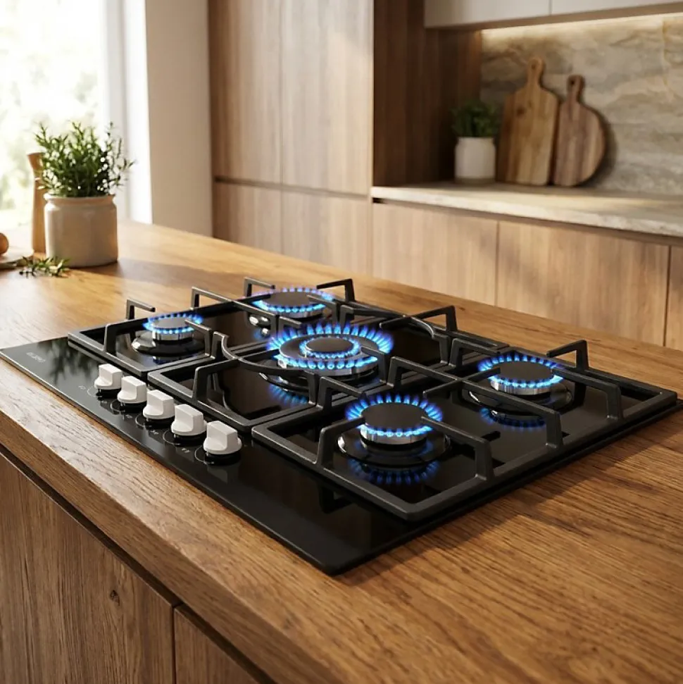 - Matière : Surface en verre athermique – Grilles et chapeaux de brûleur en fonte noire