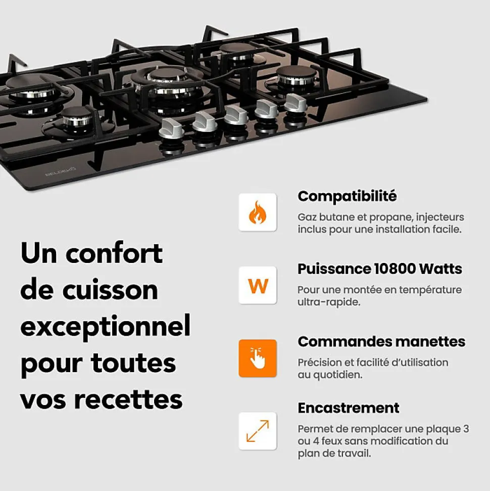 - Plaque gaz 5 foyers en verre noir, compacte et performante. Encastrement standard 56 x 49 cm pour remplacer une 3 ou 4 foyers sans modifier le plan de travail.