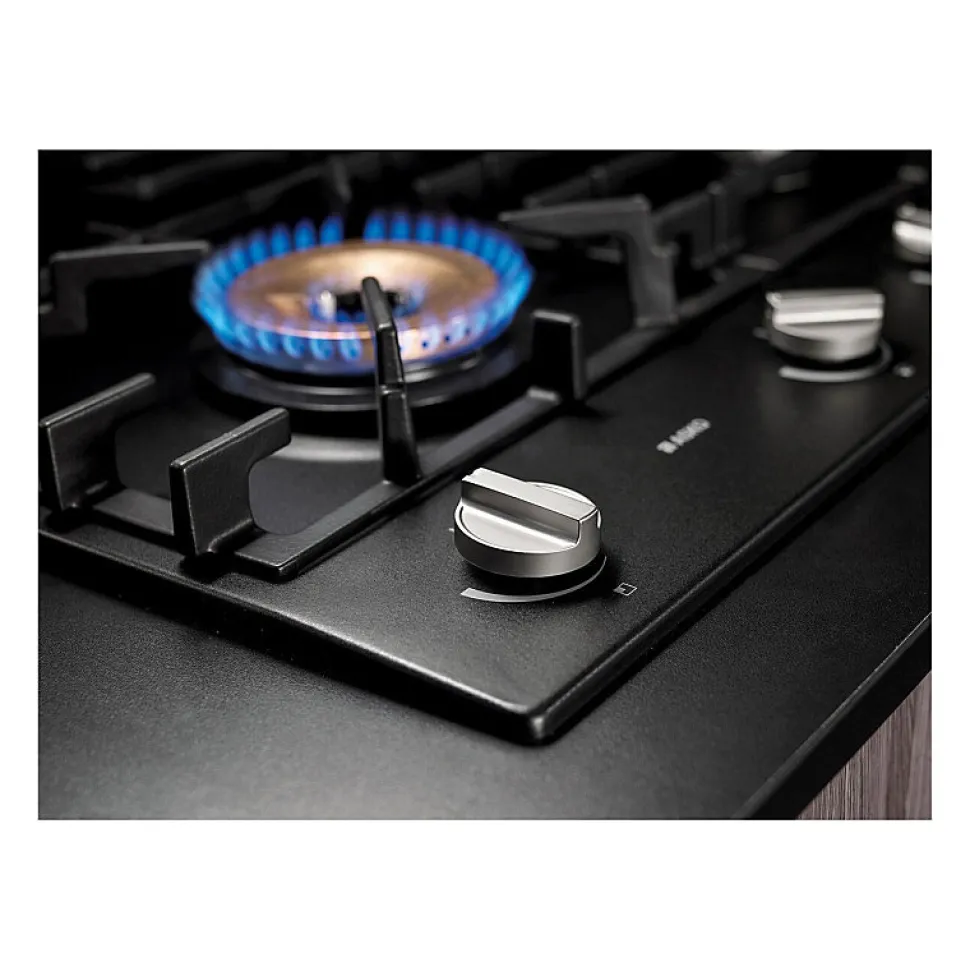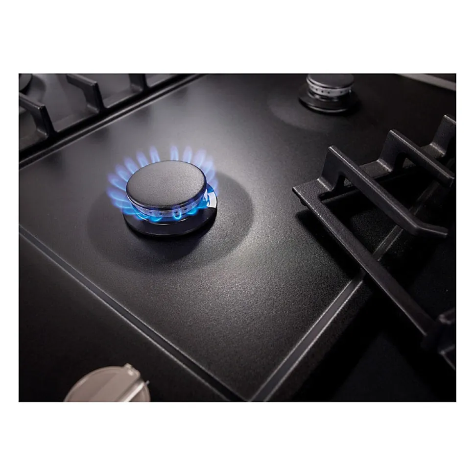 Plaque gaz Asko HG1986AB Noir graphite avec 5 brûleurs performants, dont un foyer wok de 4,6 kW, surface en verre noir résistant et grilles en fonte, conçue pour une cuisson puissante et précise dans un design élégant et facile à installer.