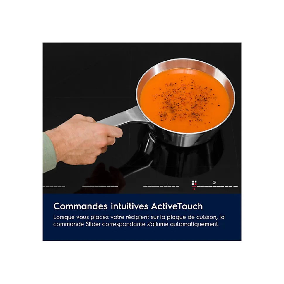 Plaque induction Electrolux DIV6747C offrant une flexibilité maximale avec technologie TotalFlex, 4 foyers avec boosters, minuteurs individuels, sécurité renforcée, et connectivité Hob2Hood.