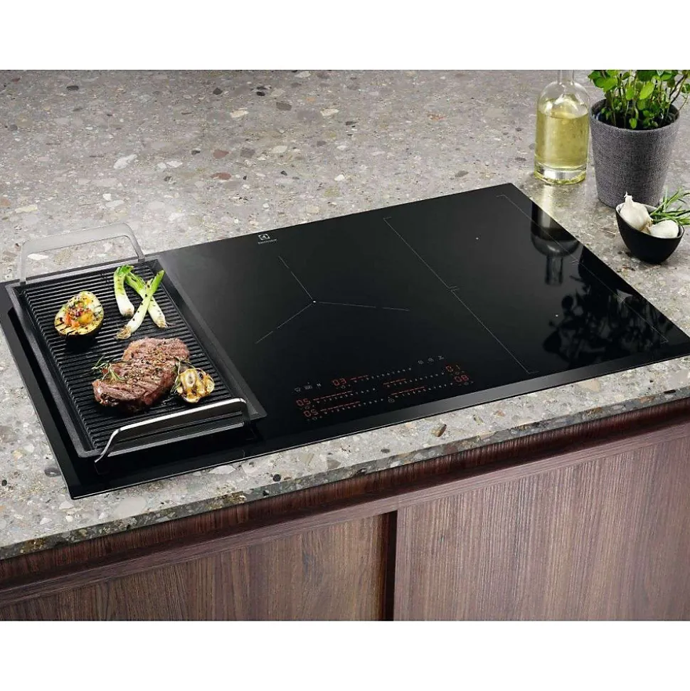 Plaque induction Electrolux EIV95550 avec 5 foyers, dont 2 zones FlexiBridge. Possède un foyer principal avec puissance PowerBoost jusqu’à 3700 W, design noir mat avec verre résistant, encastrable avec épaisseur de 44 mm. Comprend des systèmes de sécurité anti-débordement, anti-surchauffe et verrouillage enfant pour une utilisation sécurisée. Commandes sensitves intuitives en façade. Fabrication européenne avec disponibilité des pièces détachées pendant 10 ans.