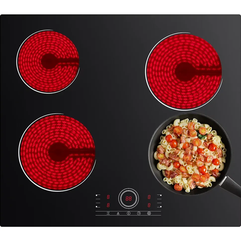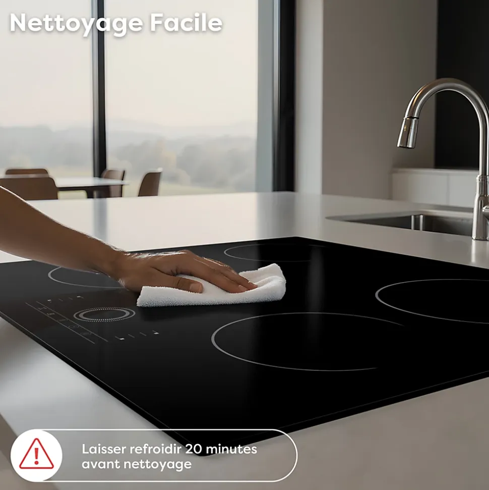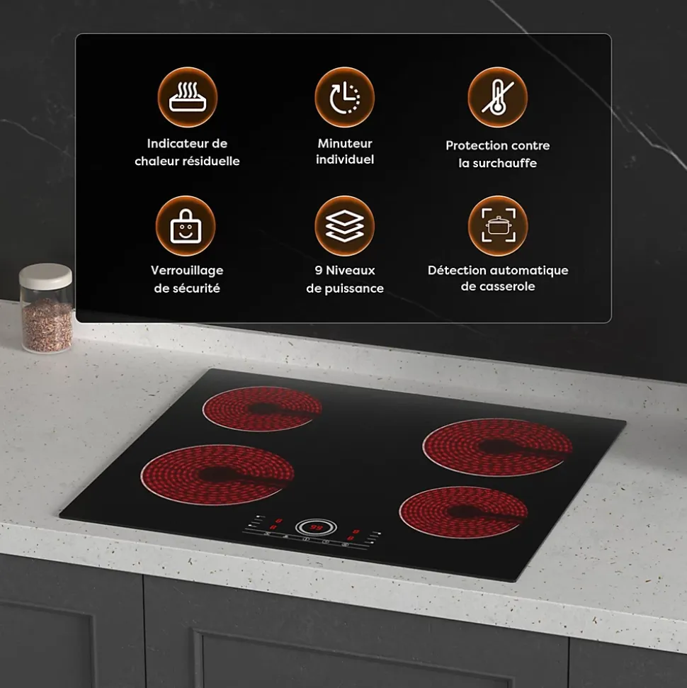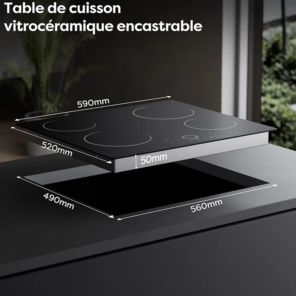 SpécificationsType de produit : Plaque vitrocéramiqueNombre de foyer(s) : 4 foyersMatériau de la surface : verreMode d’installation: EncastrableBooster: NonCommande: Tactile avec Affichage DigitalPrise:Sans prisePuissance totale : 6000WTension / fréquence : 220-240V / 50HzCourant nominal : 32ANiveau de puissance: 9Minuteur sur chaque zone: 0 – 99 minutesPuissance et diamètre des zones :Zone Avant Gauche/Zone Arrière Droite: 200mm,1800w (Diamètre du fond des casseroles:140-260mm)Zone Arrière Gauche/Zone Arrière Droite: 165mm,1200w (Diamètre du fond des casseroles:120-200mm)Dimensions et PoidsDimensions de la plaque à induction: LxHxP : 59*52*5cmDimensions d’encastrement : 56*49cmPoids net de la tables de cuisson : 7.5 KgConseil d’utilisation: Laisser refroidir la plaque de cuisson pendant 20 minutes avant nettoyagePackage inclus:1 x table de cuissson vitrocéramique1 x Notice en Français
