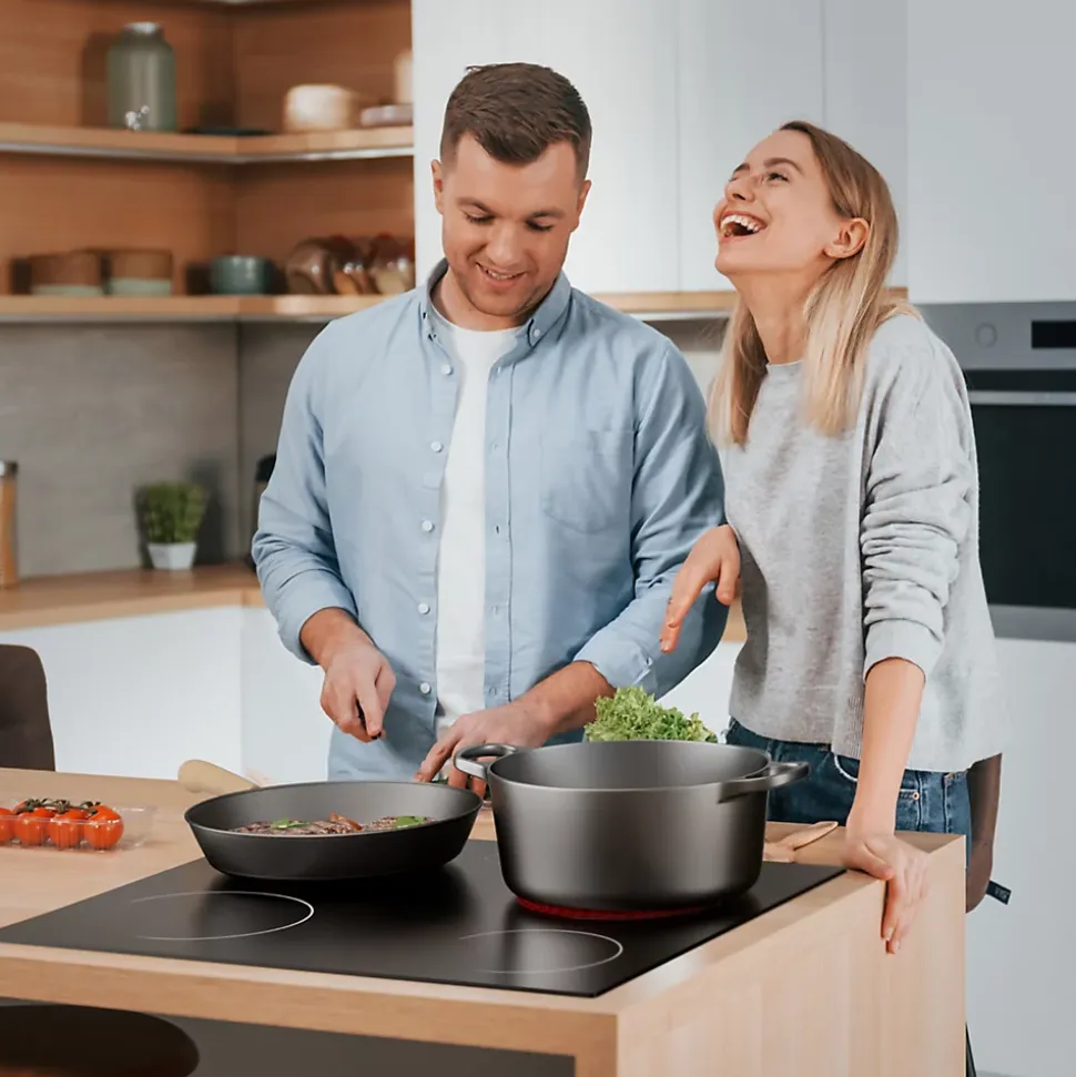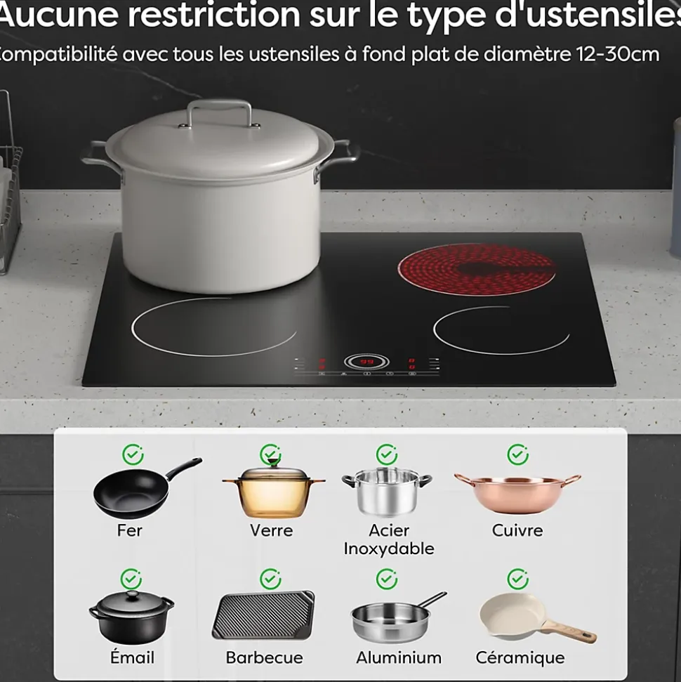 - Compatible tous ustensiles – acier, fonte, céramique ou verre, sans restriction.