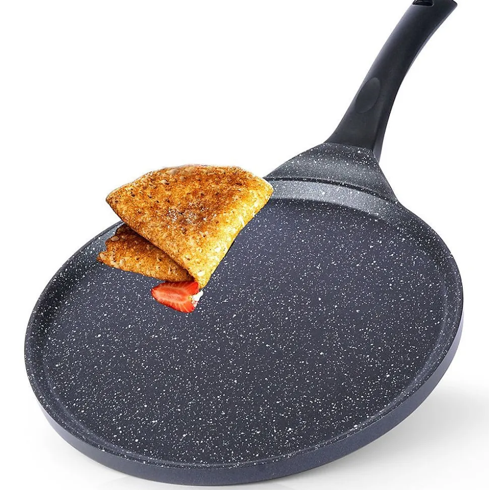 La poêle à crêpes GRANDE granit est une pièce robuste en aluminium moulé, conçue pour les amateurs et les professionnels qui recherchent une cuisson uniforme et sans accroche pour les crêpes, galettes et omelettes. Caractéristiques Revêtement granit antiadhésif sans PFOA ni PTFE Matériau: aluminium moulé, solide et durable Diamètre extérieur: 26 cm Dimensions externes: longueur 47 cm, hauteur de la poêle 1,5 cm, hauteur avec la poignée 7 cm Poignée: en matériau durable et résistant, reste froide au toucher Compatibilité chaleur: gaz, électrique, céramique, halogène et induction Entretien: compatible lave-vaisselle Utilisation: idéale pour crêpes, galettes et omelettes Avantages Cuisson rapide et homogène: la répartition uniforme de la chaleur améliore la cuisson et réduit les temps de préparation Réduction de la matière grasse: le revêtement granit facilite la cuisson à faible teneur en matière grasse Prévention des accrocs: surface antiadhésive ne réagit pas avec les aliments et est sans PFOA/PTFE Utilisation et entretien faciles: manche confortable et froid, rebords fins facilitant le versement et le retournement, nettoyage simple Polyvalence: adaptée à toutes les sources de cuisson, y compris l’induction