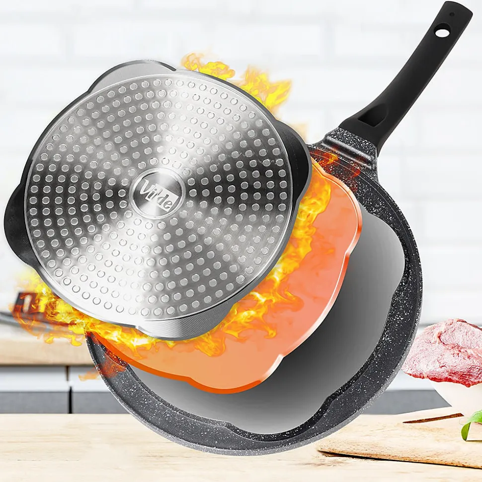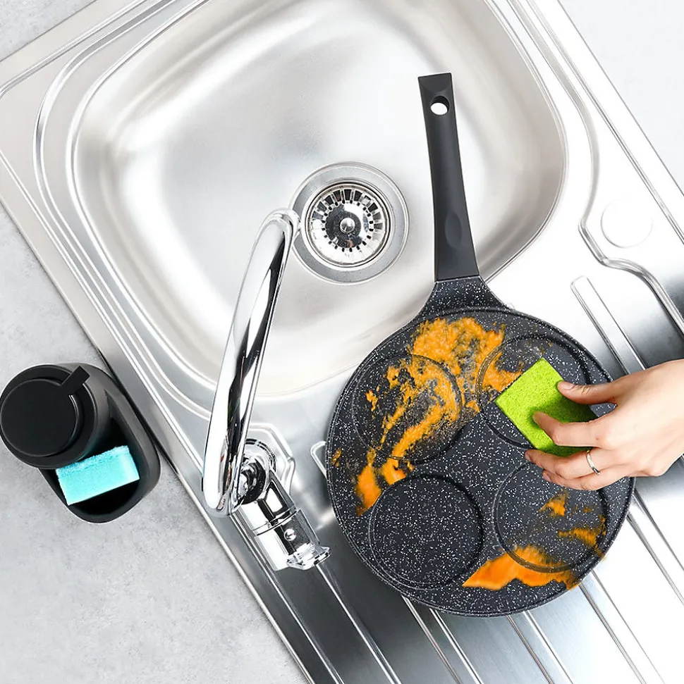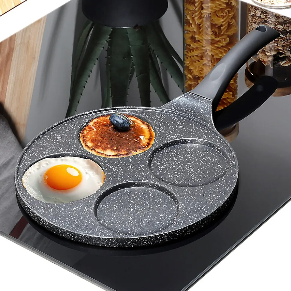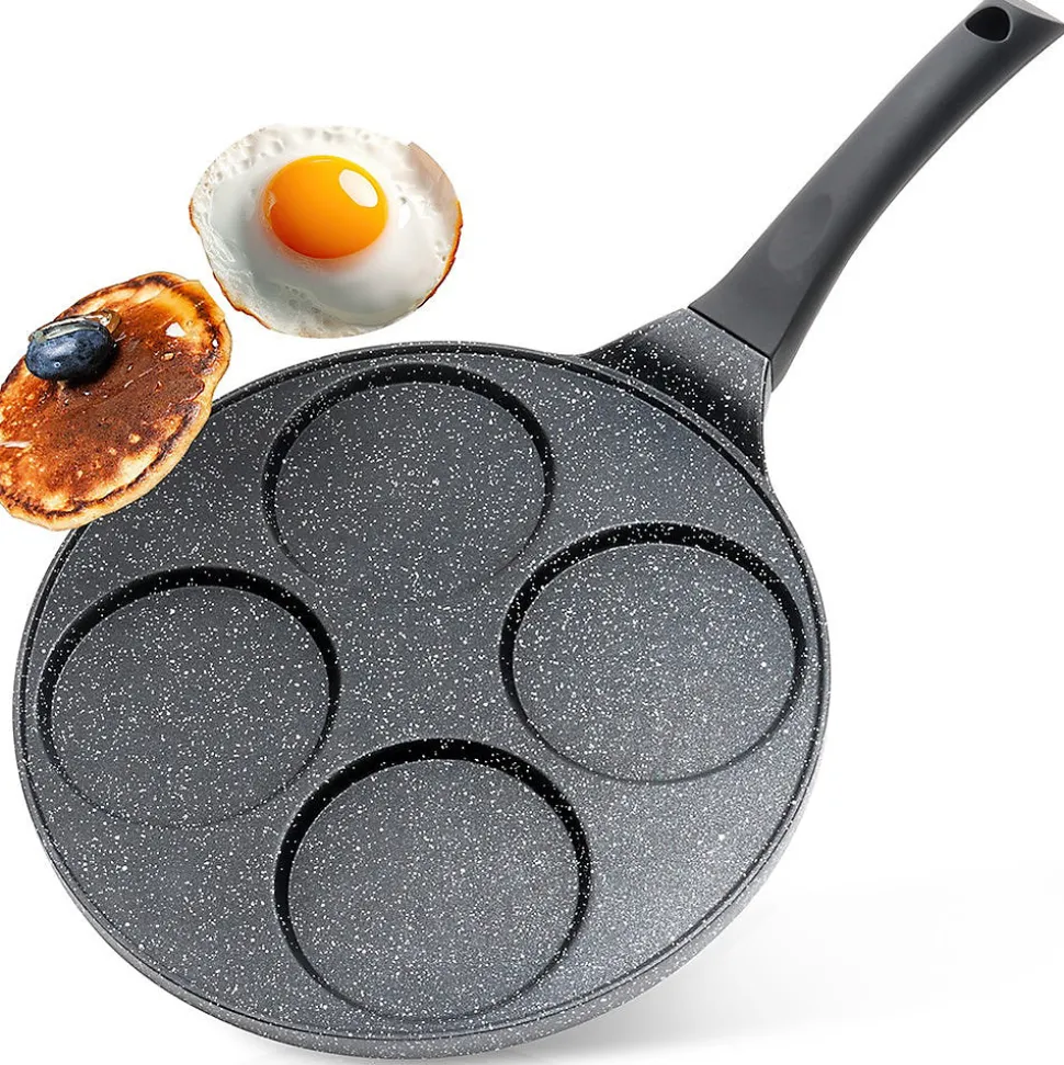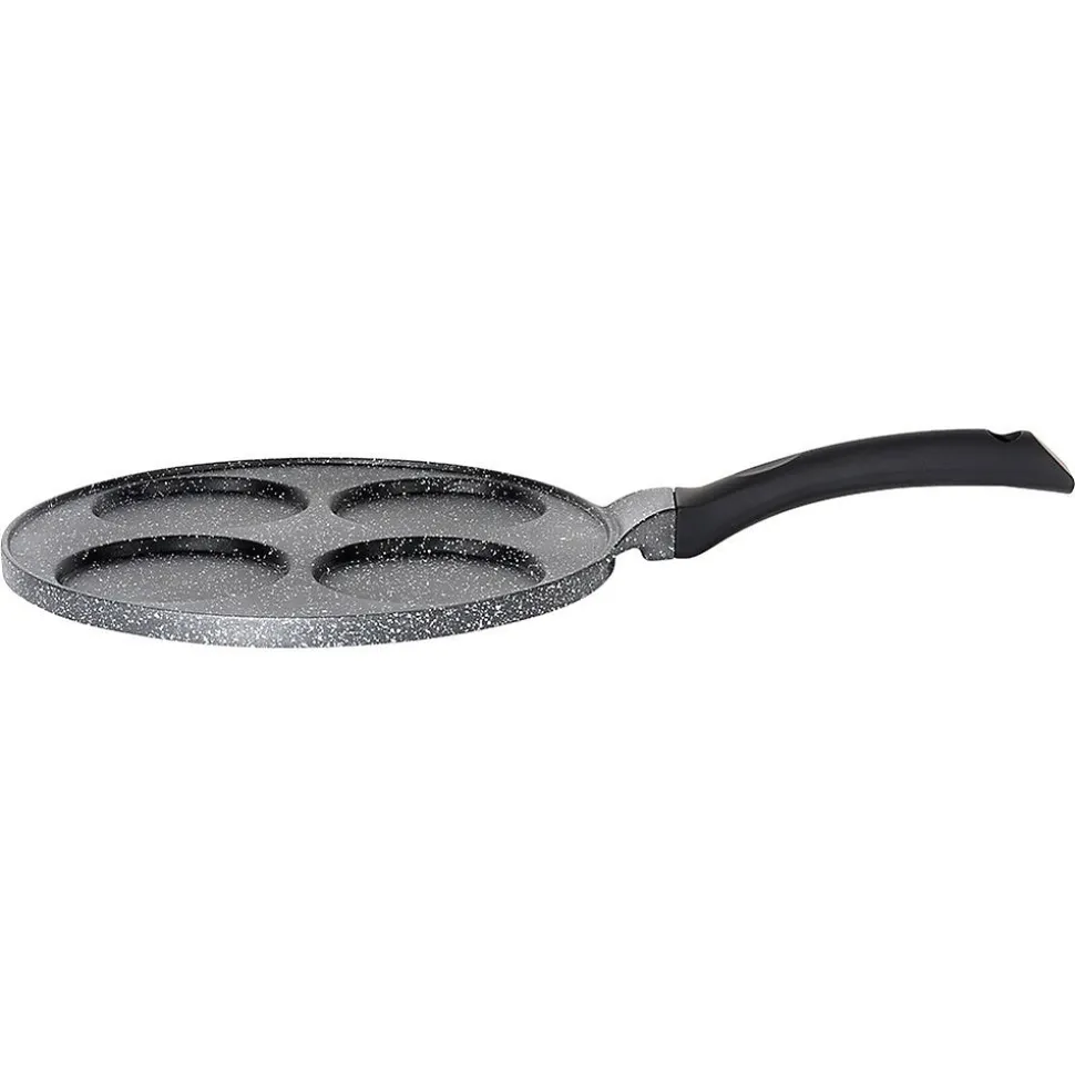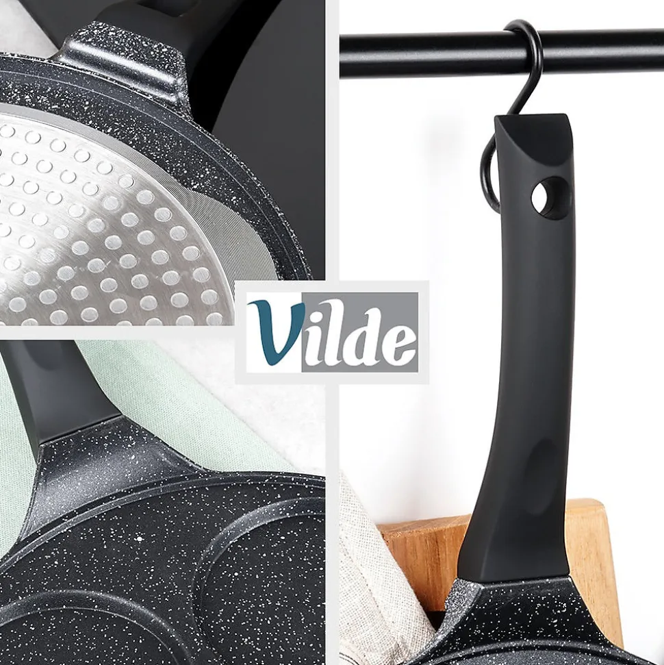 Découvrez la Poêle À Œufs En Granit 4 Alvéoles Black Line 26 cm, l’ustensile idéal pour réussir des œufs au plat parfaitement ronds, des pancakes et des mini-crêpes. Dotée de quatre alvéoles dédiées de 9 cm, elle offre un rendu uniforme et esthétique à chaque cuisson. Conçue en aluminium avec un revêtement antiadhésif granit noir, cette poêle assure une cuisson saine avec très peu de matière grasse tout en garantissant une excellente durabilité et un glissage optimisé. Sa poignée soft touch, noire et résistante, reste froide pendant la cuisson et intègre un orifice de suspension pratique pour un rangement facile sur le rélingue ou dans l’armoire. Grâce à une conduction thermique homogène, la chaleur se répartit rapidement et uniformément sur toute la surface, vous faisant gagner du temps et vous permettant d’obtenir des plats parfaitement cuits et réguliers. Caractéristiques principales Quatre alvéoles dédiées de 9 cm pour des œufs, pancakes et mini-crêpes parfaitement ronds Revêtement antiadhésif granit noir sur une base en aluminium pour une cuisson efficace et réduisant l’usage d’huile Poignée soft touch non chauffante avec trou de suspension pour un rangement pratique Conduction thermique homogène et rapide pour une cuisson maîtrisée Compatible avec toutes les cuisinières (gaz, électrique, céramique, halogène et induction) et lave-vaisselle Design intemporel de la ligne Black Line, produit original Vilde, conforme aux normes européennes Conçue pour durer et facilement entretenue, cette poêle allie style et fonctionnalité pour rehausser votre cuisine quotidienne. Commandez dès maintenant et offrez à vos matins une touche professionnelle et gourmande.