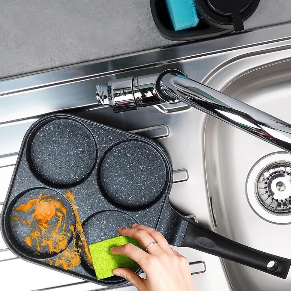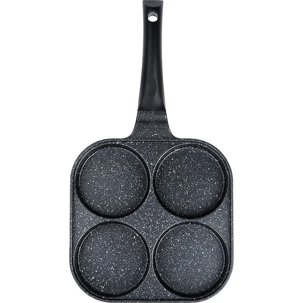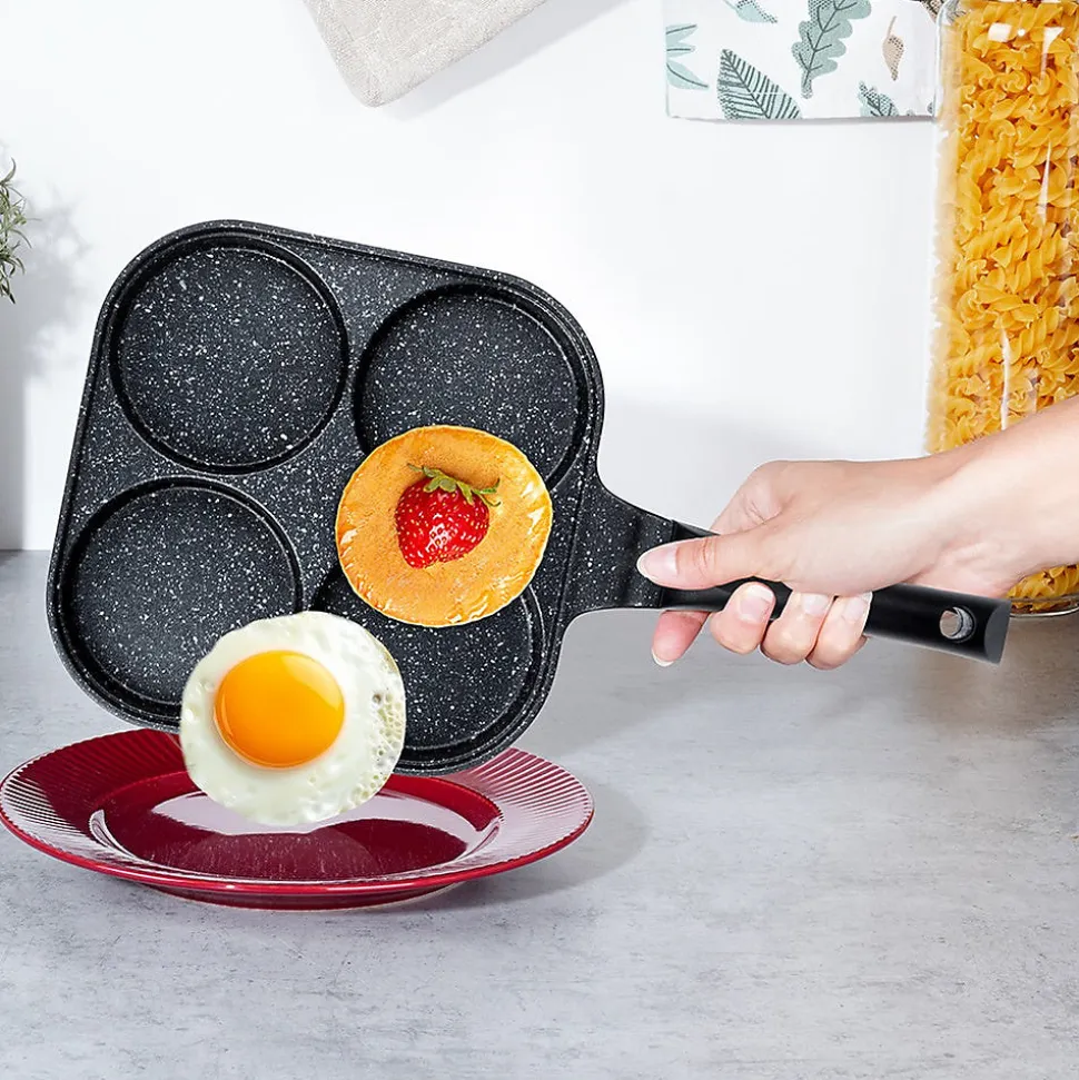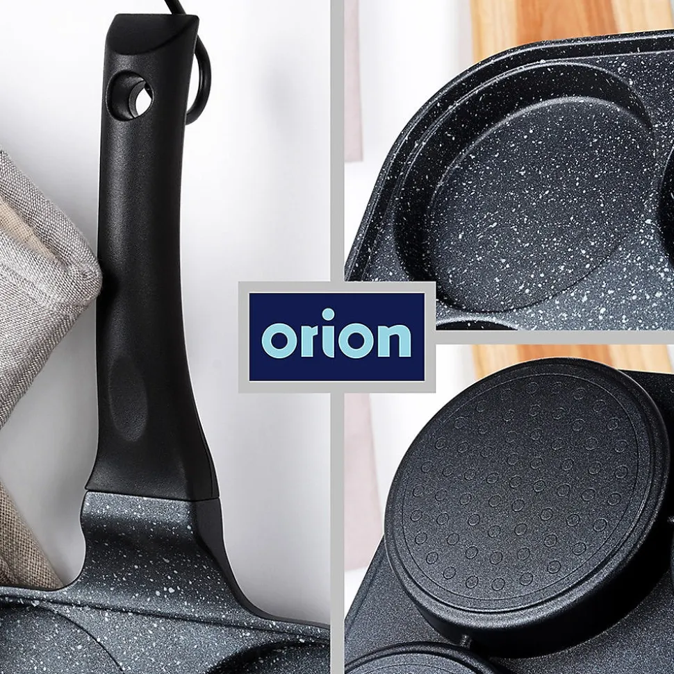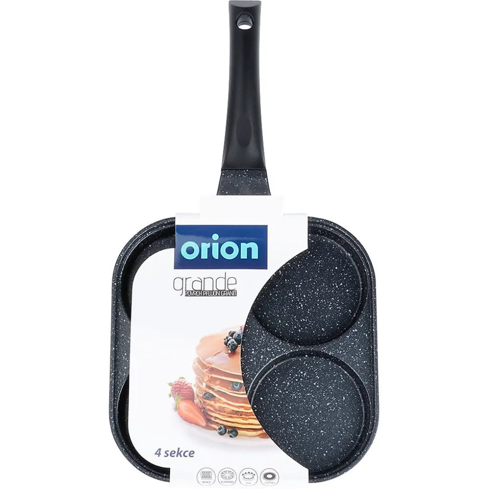 Découvrez la Poêle À Œufs En Granit Grande, l’ustensile conçu pour des œufs parfaitement ronds, des pancakes et des mini crêpes. Ses quatre orifices dédiés de 10 cm de diamètre, associés à une surface de cuisson interne de 22 x 22 cm, vous permettent d’obtenir des plats au format idéal à chaque utilisation. Dimensions extérieures: longueur 40 cm, hauteur de 2,8 cm (6 cm avec la poignée). Caractéristiques et avantages Revêtement antiadhésif granit PFLUON GRANIT en noir sur aluminium léger, pour une cuisson saine avec peu de matière grasse et un démoulage facile. Cuisson économe en énergie grâce à une excellente conductivité et à une répartition homogène de la chaleur qui réduit les temps de cuisson et les pertes. Cuisson uniforme et rapide pour œufs au plat, pancakes et mini crêpes en formes parfaites. Polyvalence de cuisson: compatible gaz, électrique, céramique, halogène et induction. Entretien pratique: compatible lave-vaisselle pour un nettoyage sans effort. Manche ergonomique et antidérapant assurant une prise en main sûre et confortable; œillet de suspension pratique pour le rangement et gagner de la place dans votre cuisine. Look intemporel et fonctionnel: design Grande série qui s’intègre élégamment à toutes les cuisines. Origine et norme: produit original de la marque tchèque Orion, fabriqué selon les normes européennes. Cette poêle à œufs en granit est la solution idéale pour obtenir des plats parfaitement façonnés tout en cuisant de manière efficace et uniforme. Parfaite pour les œufs sautés, les pancakes et les mini crêpes, elle allie performance, durabilité et élégance dans une seule pièce culinaire.