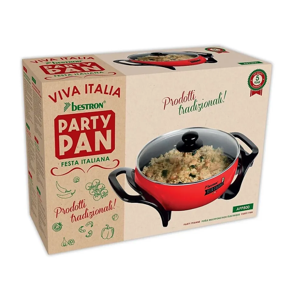 Poêle électrique multifonction 26cm 1500w Bestron – Poêle électrique APP800 de Bestron multifonction , idéal pour cuisiner,rôtir, cuire à la vapeur, décongeler, garder au chaud etréchauffer. Peut s’utiliser rapidement et pour différents plats comme : le risotto, la paella, les pâtes, les soupes, les légumes, des plats de viande et de poisson en sauce, etc.. Idéale pour des fêtes et des buffets et pour garder auchaud sur la table. – Type de produit : Poêle électrique.Puissance : 1500W.Revêtement antiadhésif.Thermostat amovible et réglable avec témoin lumineux.Couvercle en verre avec sortie de vapeur et poignée (peut aller au lave-vaisselle).Poignées résistantes à la chaleur.Facile à nettoyer.Pieds antidérapants.Livret en couleur contenant différentes suggestions de repas.Couleur : Rouge.Poids : 3 kg.