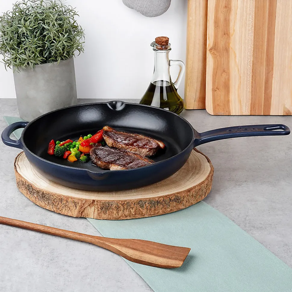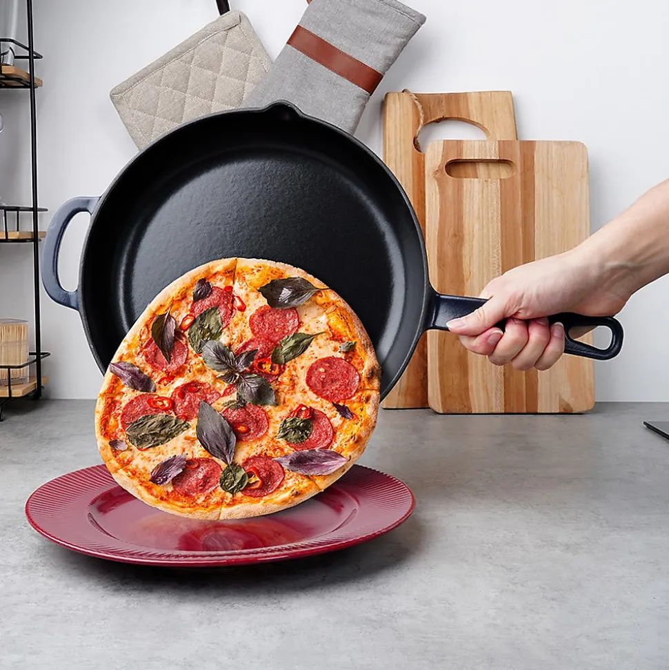 Découvrez la Poêle en fonte émaillée Litina 28 cm, une pièce polyvalente et robuste pour toutes vos cuissons. Conçue pour offrir une répartition rapide et homogène de la chaleur, elle vous permet de saisir, rôtir et mijoter vos plats avec une précision professionnelle. Émaillée en noir à l’intérieur et avec une coque extérieure bleu/grenat, cette poêle allie élégance et praticité. L’émail facilite le démarrage et le service, tout en simplifiant nettement le nettoyage. La fonte retient la chaleur et la conserve longtemps, garantissant des plats bien chauds et savoureux jusqu’au dernier service. Équipements et design pratique: Diamètre 28 cm, dimensions extérieures: longueur avec poignées 46,5 cm, largeur 29,5 cm, hauteur de la poêle 4,8 cm et 6,3 cm avec la poignée. Deux poignées pour un transport sûr et stable. Deux becs verseurs pour servir facilement vos plats. Orifice dans la poignée pour la suspension et le rangement. Série Litina – une fabrication robuste et durable, idéale pour un usage quotidien. Polyvalente et adaptée à toutes les cuisines, elle convient aussi bien à la cuisson à la poêle qu’au four. Utilisable sur gaz, électrique, vitrocéramique, halogène et induction, elle supporte les hautes températures et est prête pour saisir, dorer, puis terminer vos plats au four. Vous pouvez même l’employer pour des pizzas, des pommes de terre rôties, des plats de viande et de légumes, ou servir directement à table. Entretien et durabilité: l’émail facilite le nettoyage et empêche les aliments d’adhérer, tout en offrant une résistance élevée à la corrosion. Bien qu’elle soit compatible lave-vaisselle, un lavage à la main reste recommandé pour prolonger la durée de vie du revêtement. Produit original de la marque tchèque Orion, fabriqué selon les normes européennes, pour des cuissons fiables et des résultats constants à chaque utilisation.