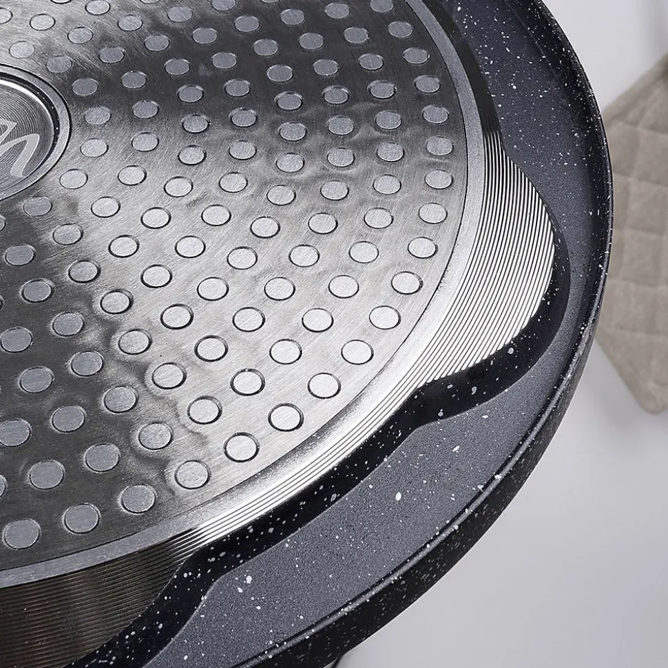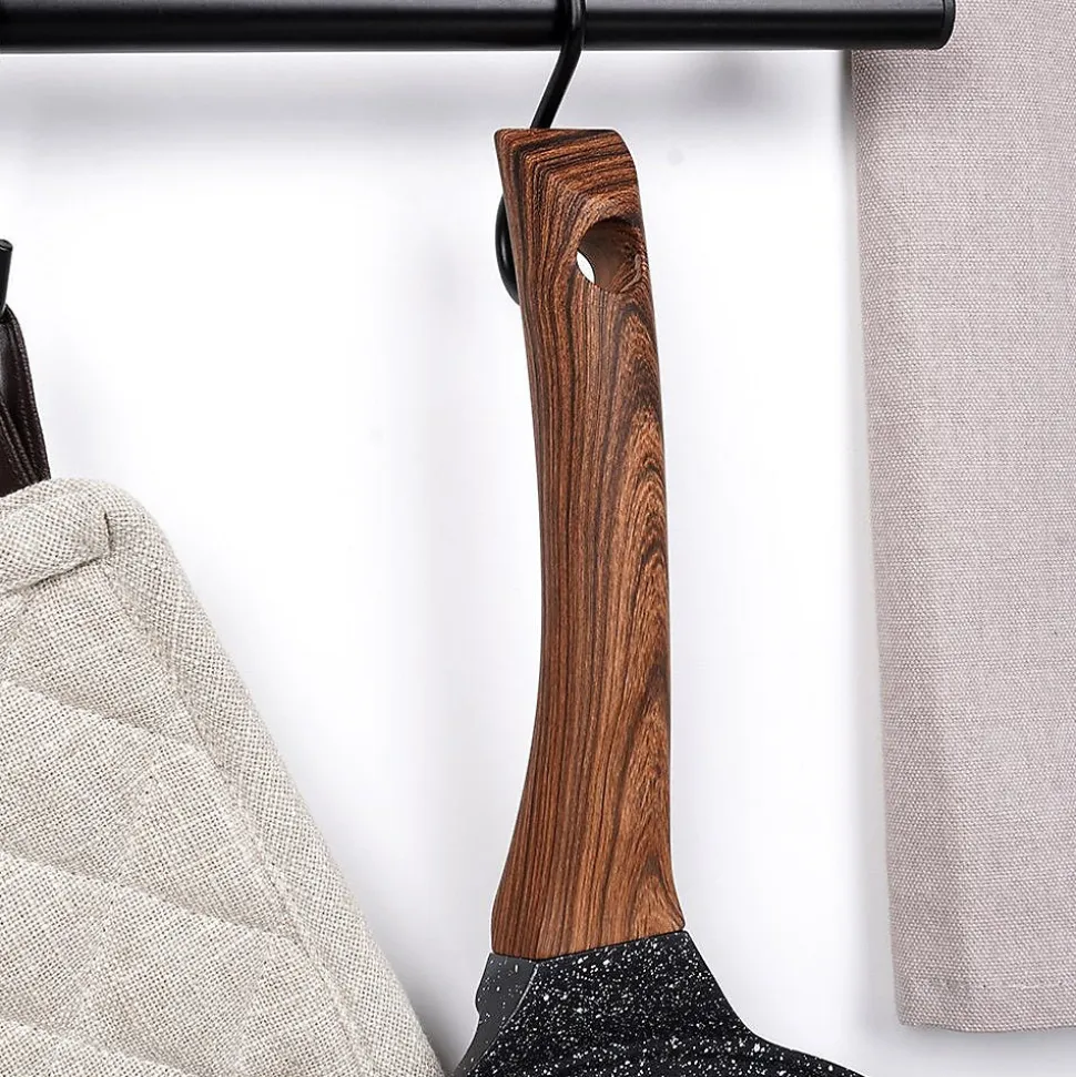 La Poêle Œufs Granit 7 Alvéoles de 8 cm – Black&Wood, 26 cm, est l’outil parfait pour des œufs au plat parfait, des mini-pancakes et des pancakes en forme de visages souriants grâce à ses sept alvéoles dédiées. Alliant élégance et praticité, elle transforme chaque petit-déjeuner en moment gourmand tout en étant facile à utiliser et à entretenir. Sept alvéoles de 8 cm pour des portions parfaitement uniformes et une cuisson homogène. Revêtement antiadhésif granit noir pour des cuissons saines avec peu ou pas de matière grasse et un démoulage sans effort. Aluminium de haute qualité avec distribution thermique optimisée garantissant une chaleur uniformément répartie et des économies de temps. Poignée ergonomique imitatrice de bois anti-glisse et résistante à la chaleur, pour une prise en main sûre et confortable. Compatibilité universelle avec gaz, électrique, céramique, halogène et induction, adaptée à toutes les plaques. Entretien facile et lavable au lave-vaisselle pour un nettoyage rapide après usage. Orifice de suspension pratique pour le rangement et l’optimisation de l’espace dans votre cuisine. Design Black&Wood alliant noir élégant et touches bois, pour un look moderne et intemporel dans toutes les cuisines. Conçue selon les normes européennes et conçue pour durer, cette poêle se démarque par sa combinaison parfaite de fonctionnalité et d’esthétique. Les alvéoles gravés en forme de visages souriants ajoutent une touche ludique qui plaira à toute la famille, tout en offrant une cuisson uniforme et un rendu visuel irrésistible sur chaque assiette. Dimensions externes: longueur 46,5 cm, hauteur sans manche 0,5 cm, hauteur avec manche 5,5 cm. Diamètre utile: 26 cm.