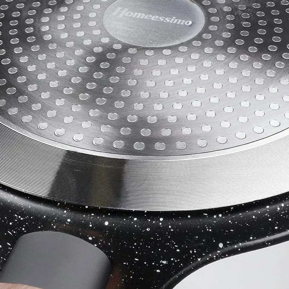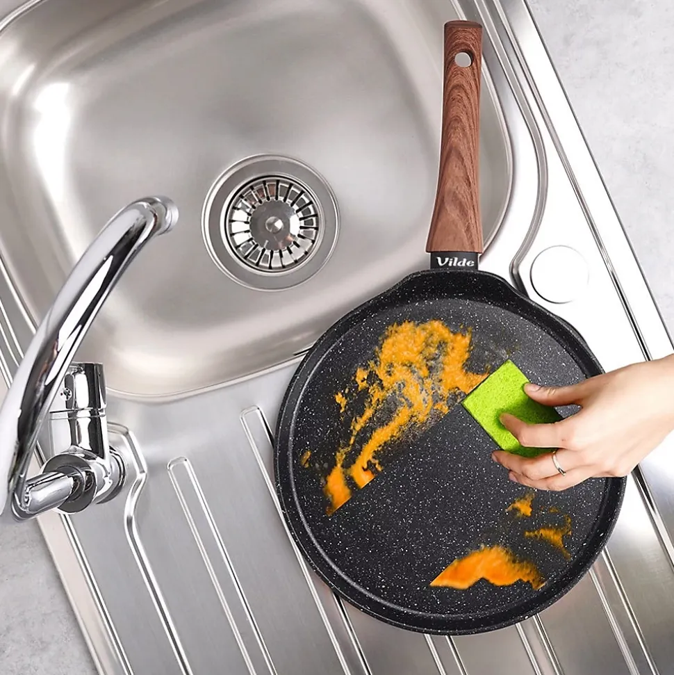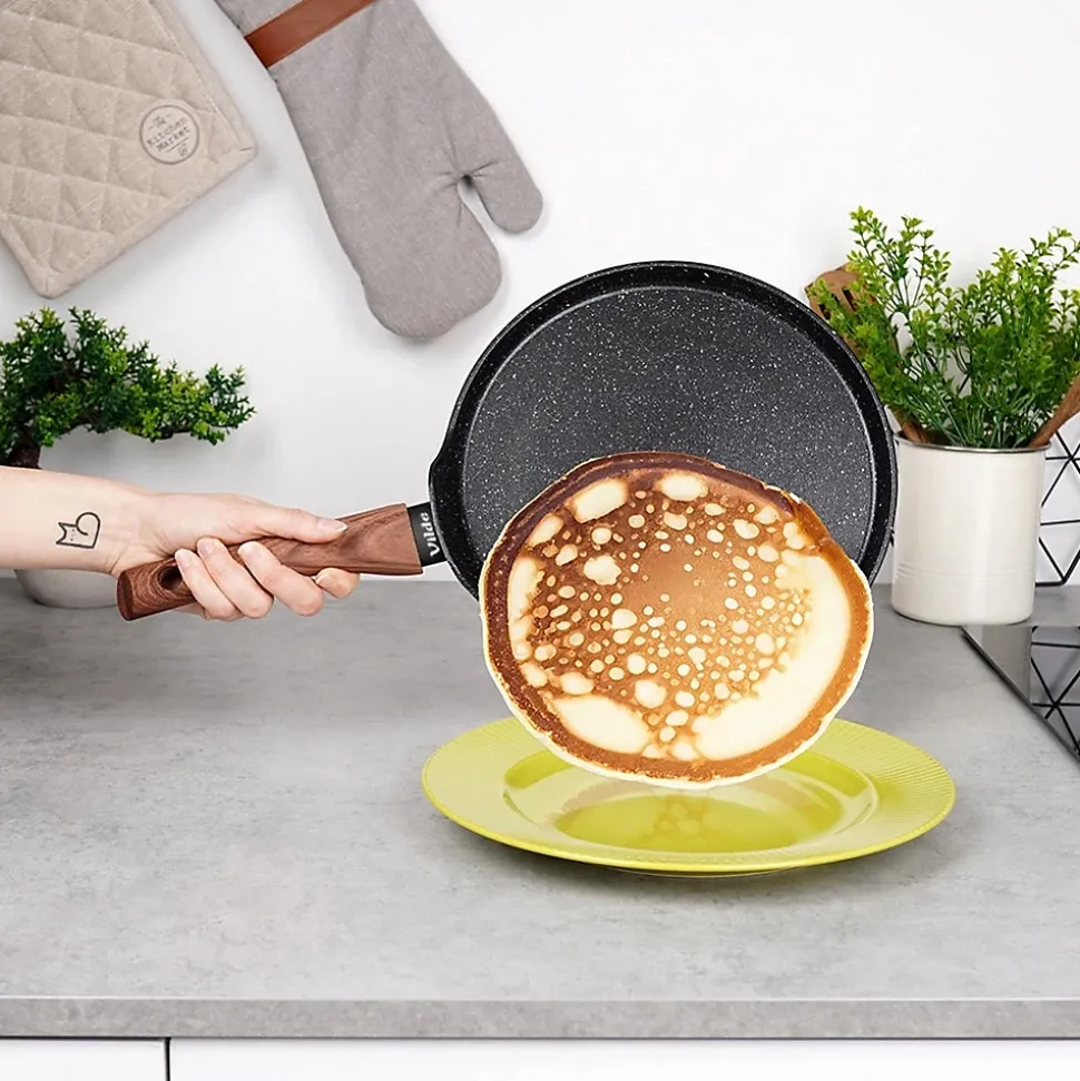 Une poêle à crêpes antiadhésive au design unique et intemporel. Son élégante combinaison de noir et de bois en fait un atout de choix pour votre cuisine. Elle vous permettra de réaliser de délicieuses crêpes, beignets et omelettes. Indispensable dans toutes les cuisines, elle facilite la préparation des repas et garantit une présentation impeccable. Fabriquée à partir de matériaux de haute qualité, elle vous accompagnera pendant de nombreuses années si vous l’utilisez correctementCaractéristiques:Longueur: 44 cm Largeur: 25 cm Hauteur: 5,5 cm Diamètre: 24 cm Poids (g) : 657Couleur dominante : noirANTIADHÉSIF – Cette poêle en aluminium est dotée d’un revêtement antiadhésif en granit noir. Sa surface antiadhésive permet de préparer des repas sains et savoureux avec un minimum de matières grasses. Elle est équipée d’une poignée en matériau durable de haute qualité imitant le bois
